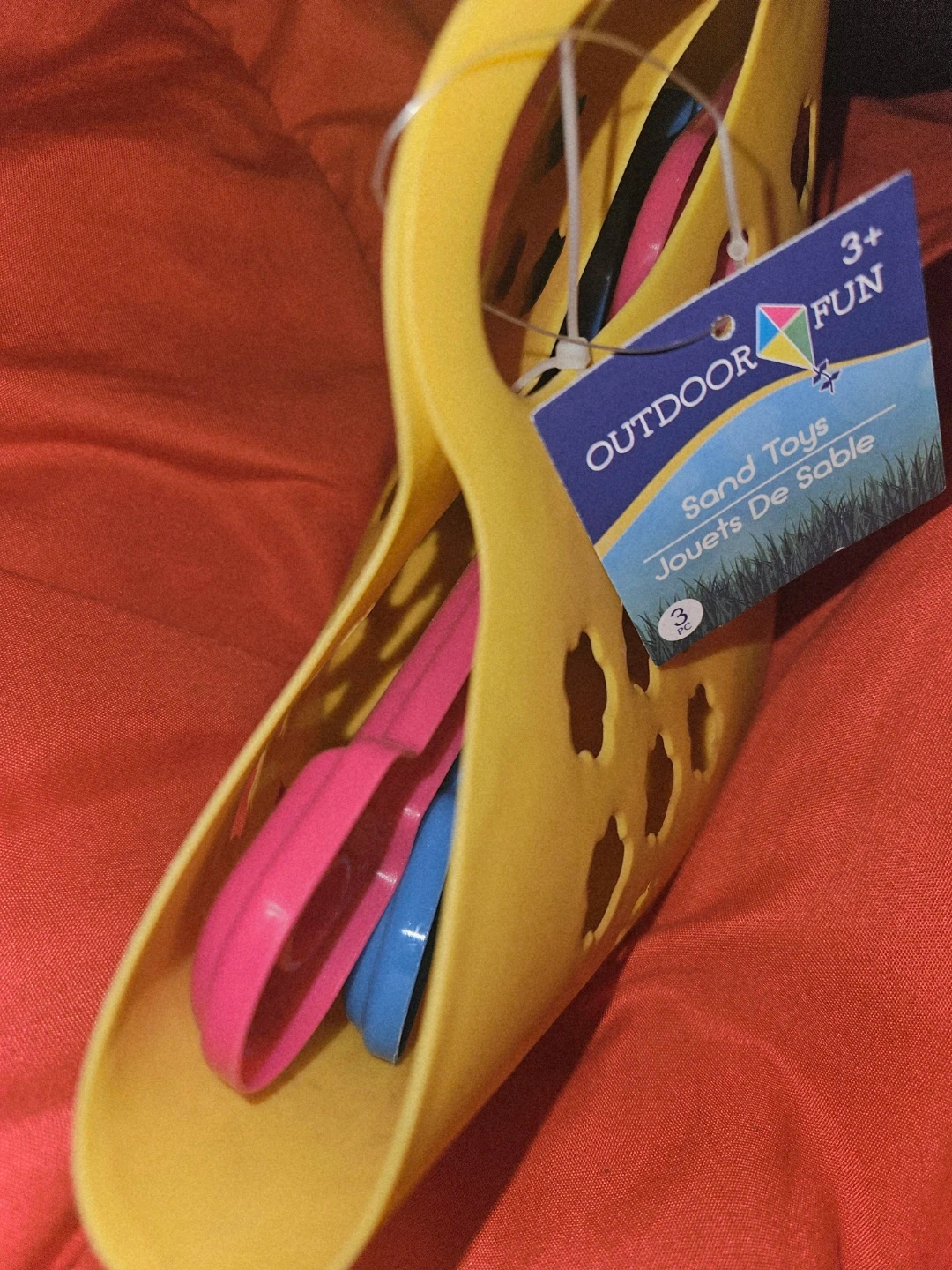 I'm selling a cute yellow sand toy set from Outdoor Fun! It includes a bucket and 3 tools for fun at the beach or in the sandbox. Recommended for ages 3+