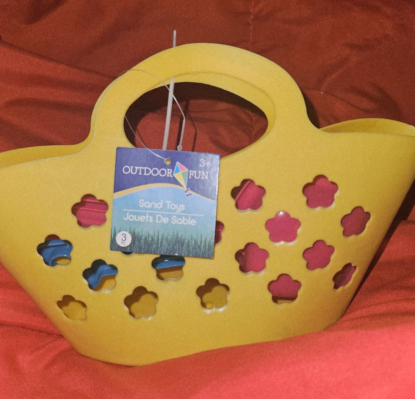I'm selling a cute yellow sand toy set from Outdoor Fun! It includes a bucket and 3 tools for fun at the beach or in the sandbox. Recommended for ages 3+