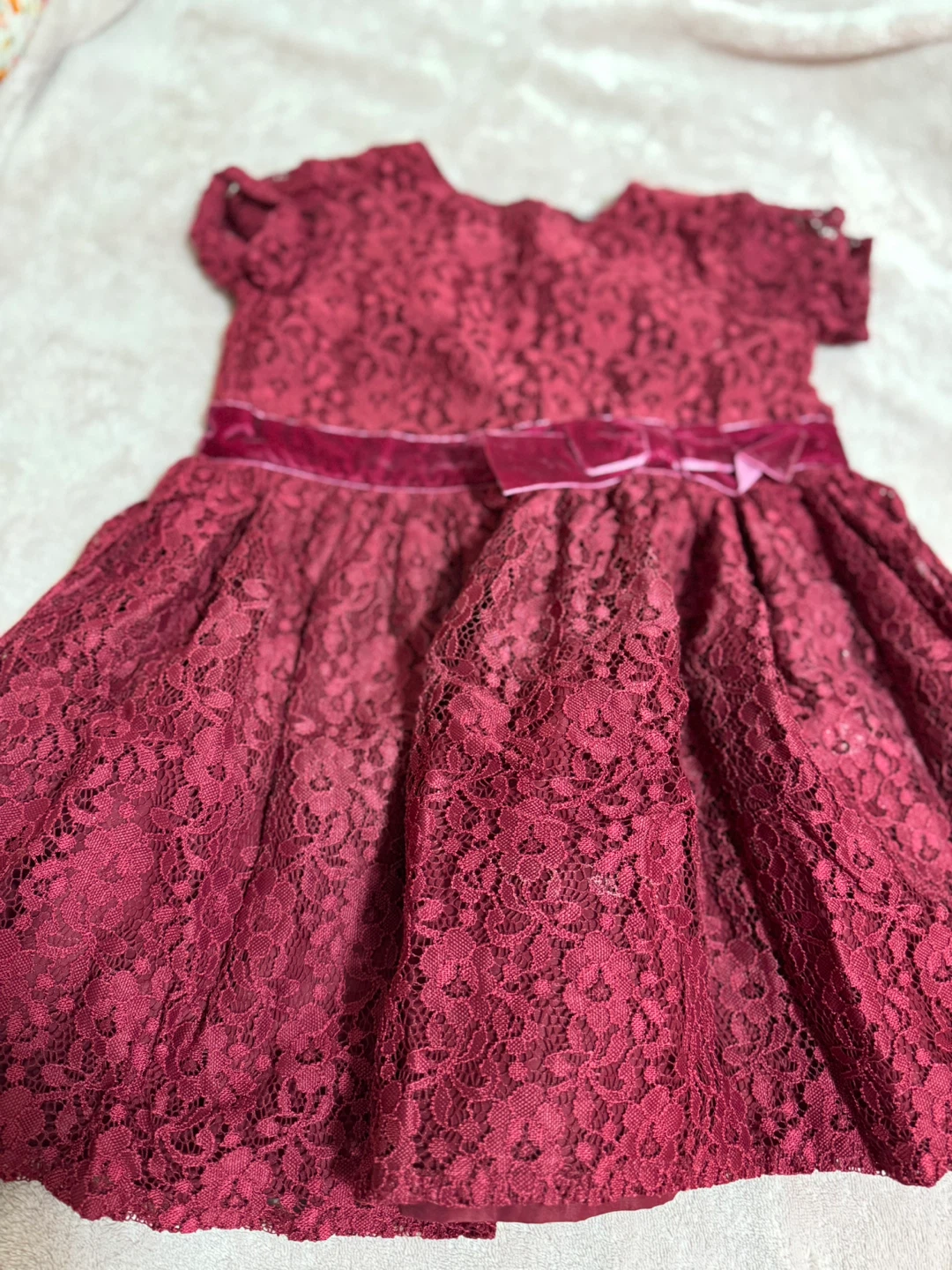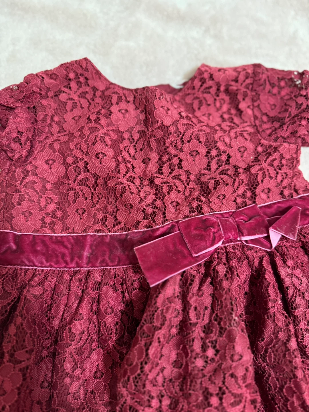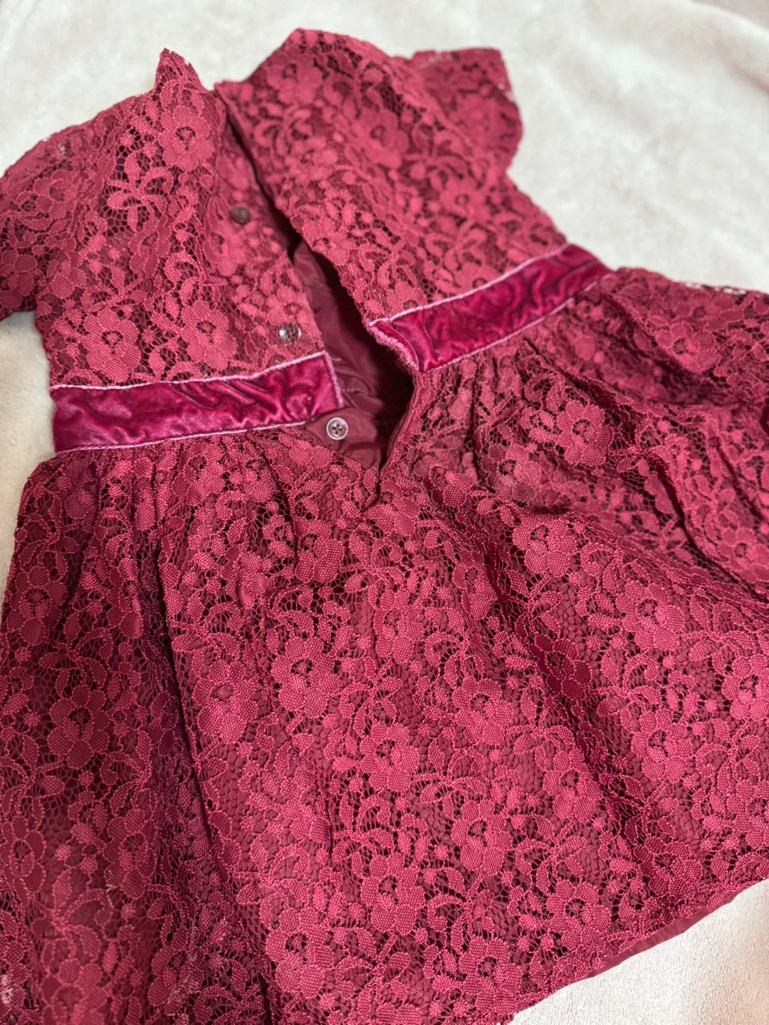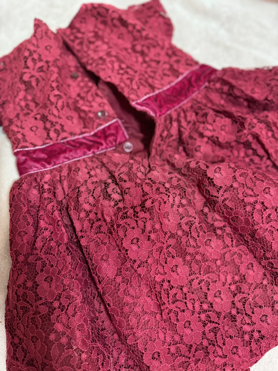 This is a lovely burgundy lace dress. It features a velvet trim around the waist and collar. The dress is in great condition and would be perfect for a special occasion!