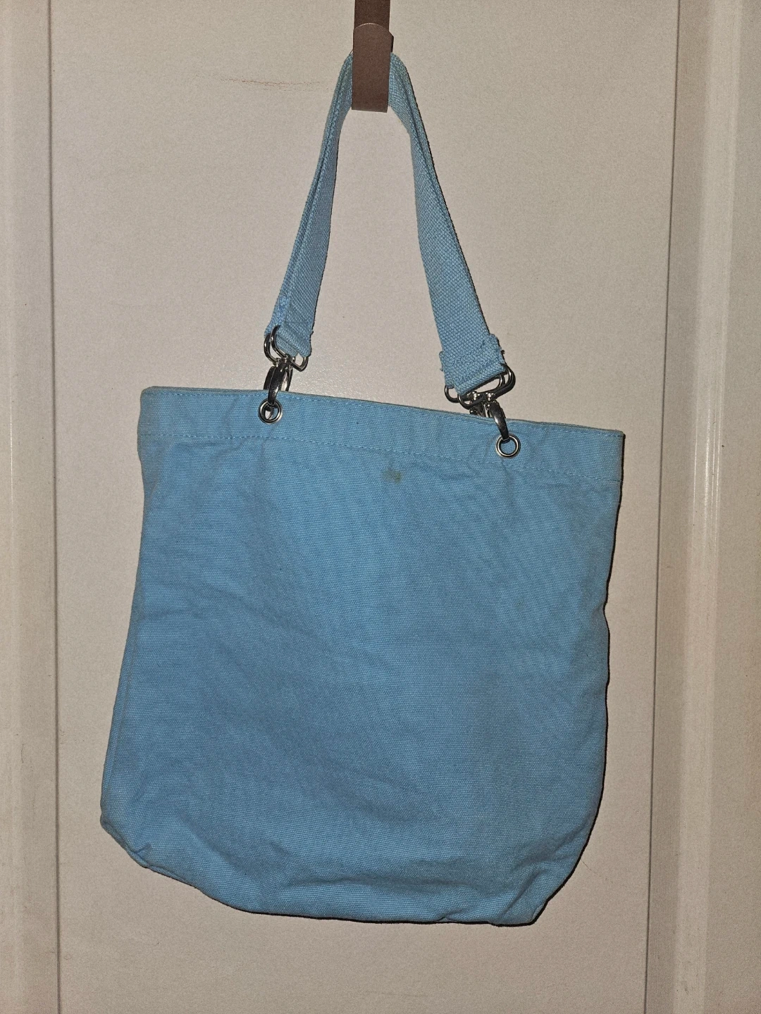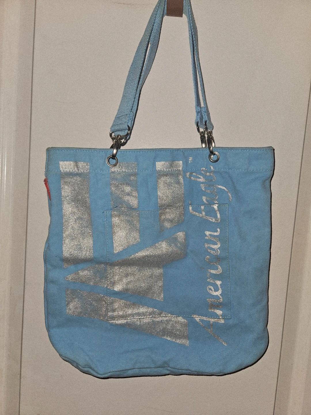 I'm selling a cute blue tote bag from American Eagle! It's perfect for carrying your everyday essentials. There is a small stain on the front as pictured, but otherwise it's in good condition and ready for a new owner