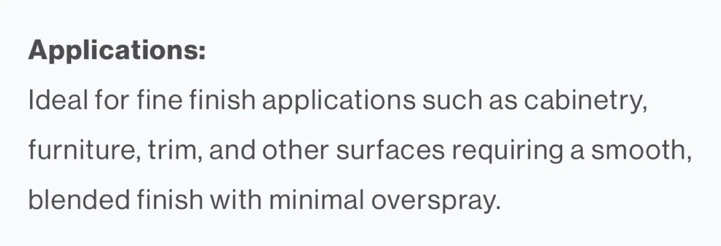Designed for fine finish applications with reduced overspray and excellent control. Ideal for professionals or serious DIYers.