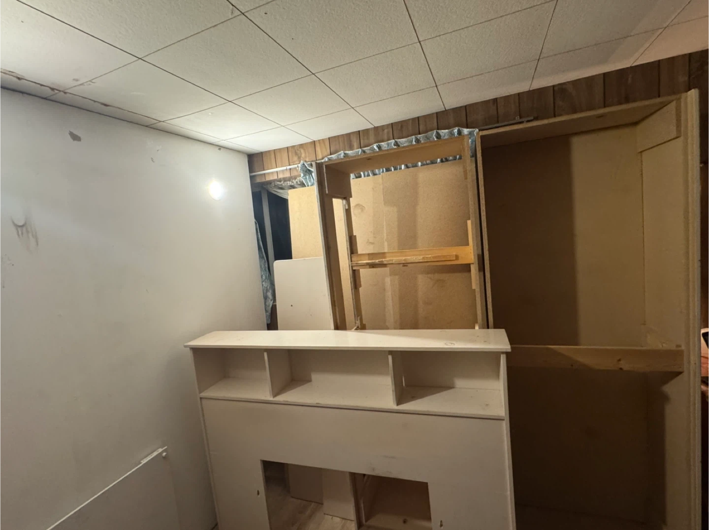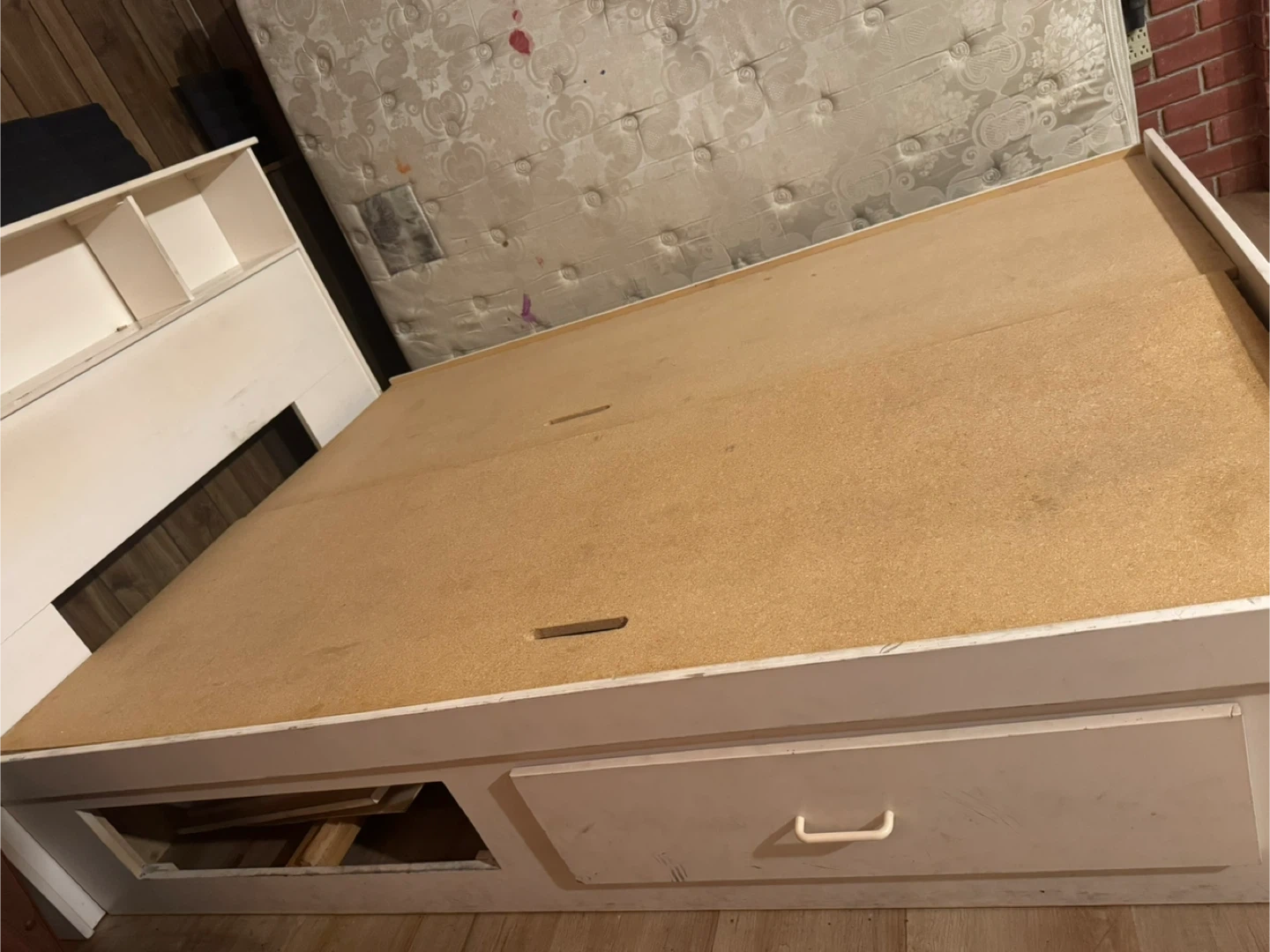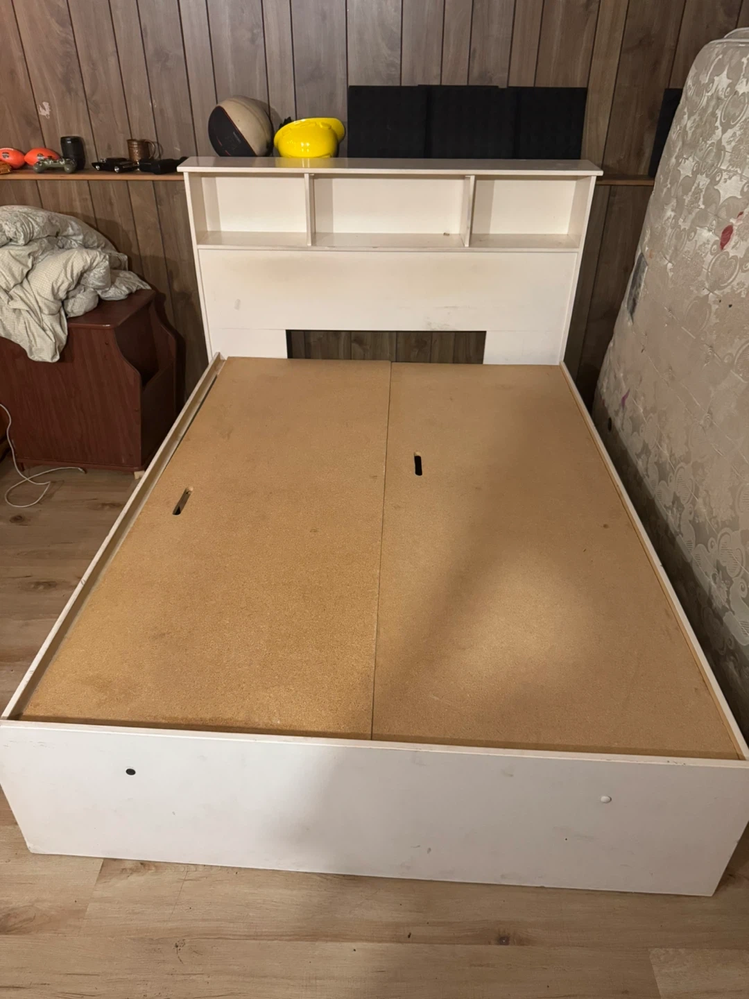 Selling a queen size bed frame with a headboard. It's white and made of wood. It has some storage space in the headboard and a drawer at the foot of the bed. Good for a bedroom or guest room