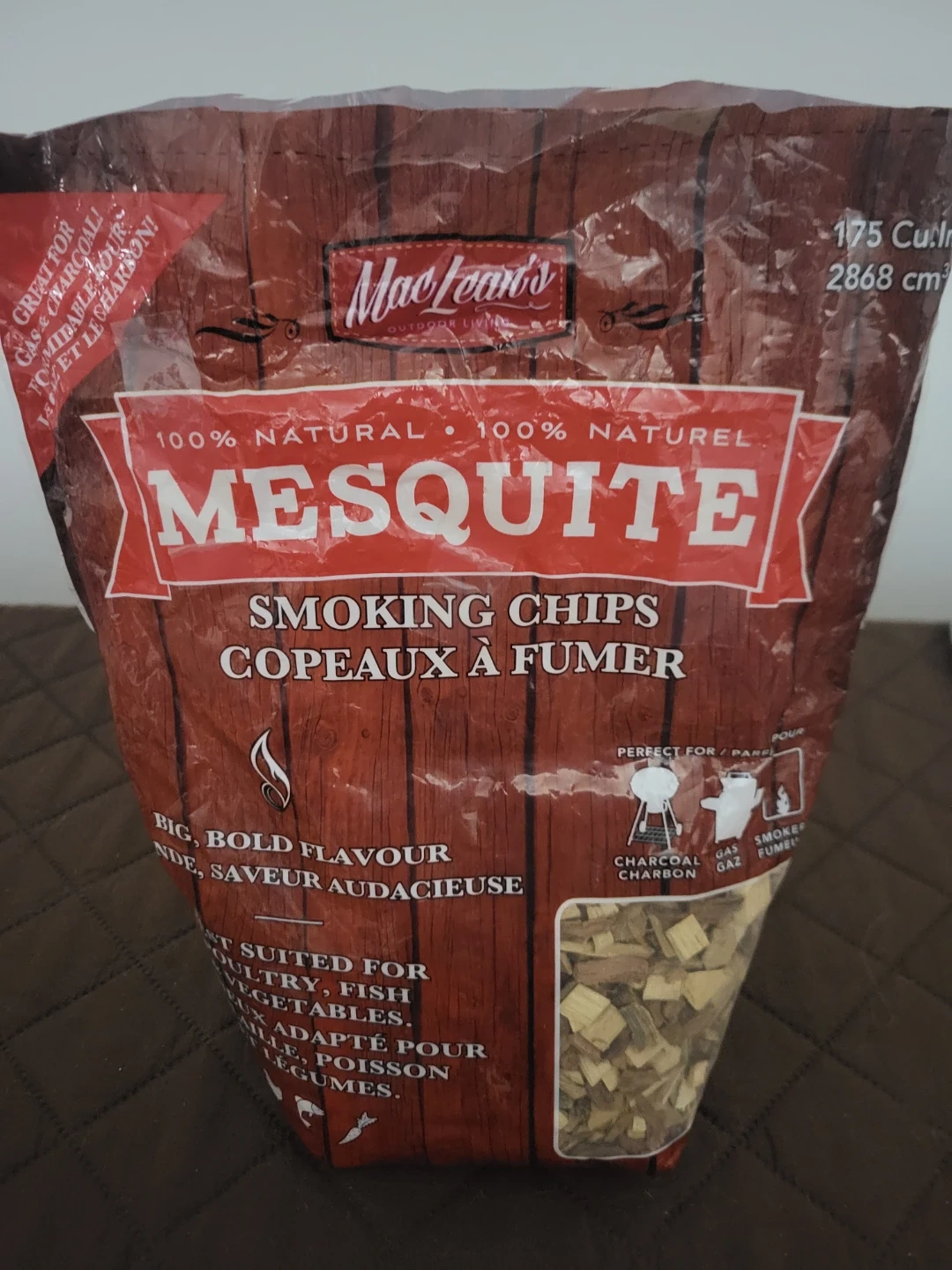 I'm selling a bag of MacLean's Mesquite Smoking Chips. They're 100% natural and perfect for adding a big, bold flavour to your grilling! Great for gas and charcoal BBQs. The bag contains 175 cu. in (2868 cm³) of chips. Suited for poultry, fish, and vegetables. Free for Pick up Only!