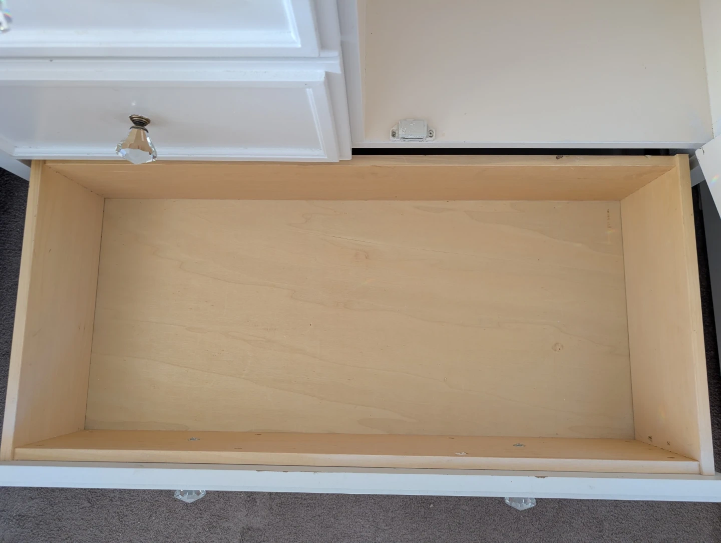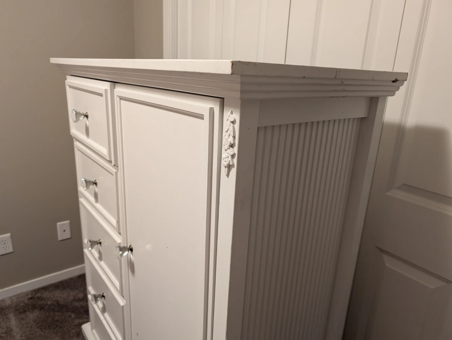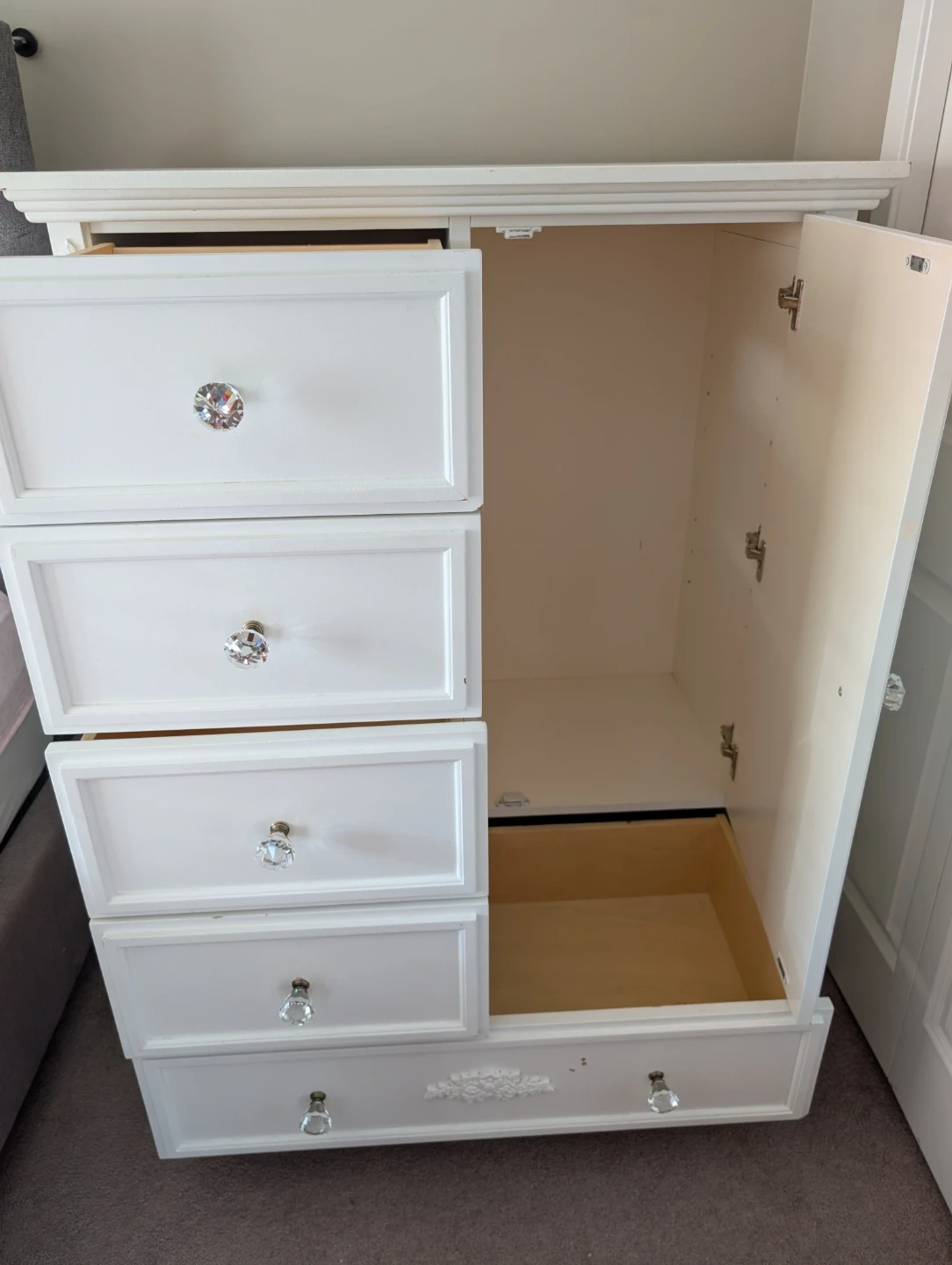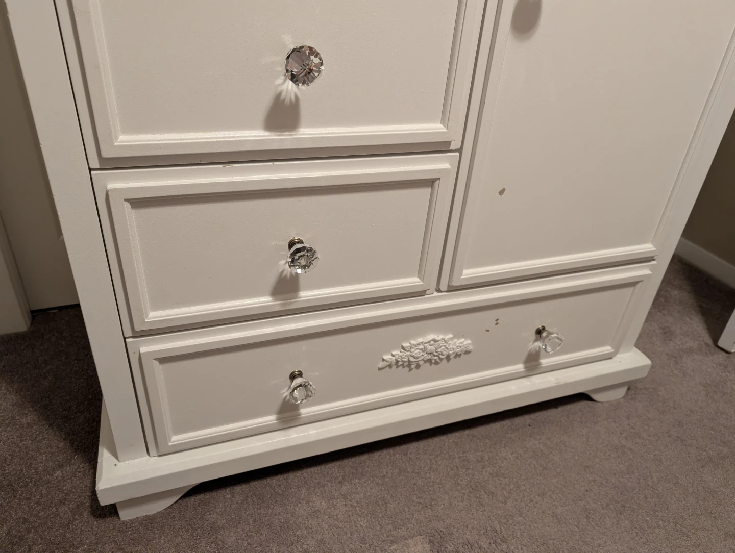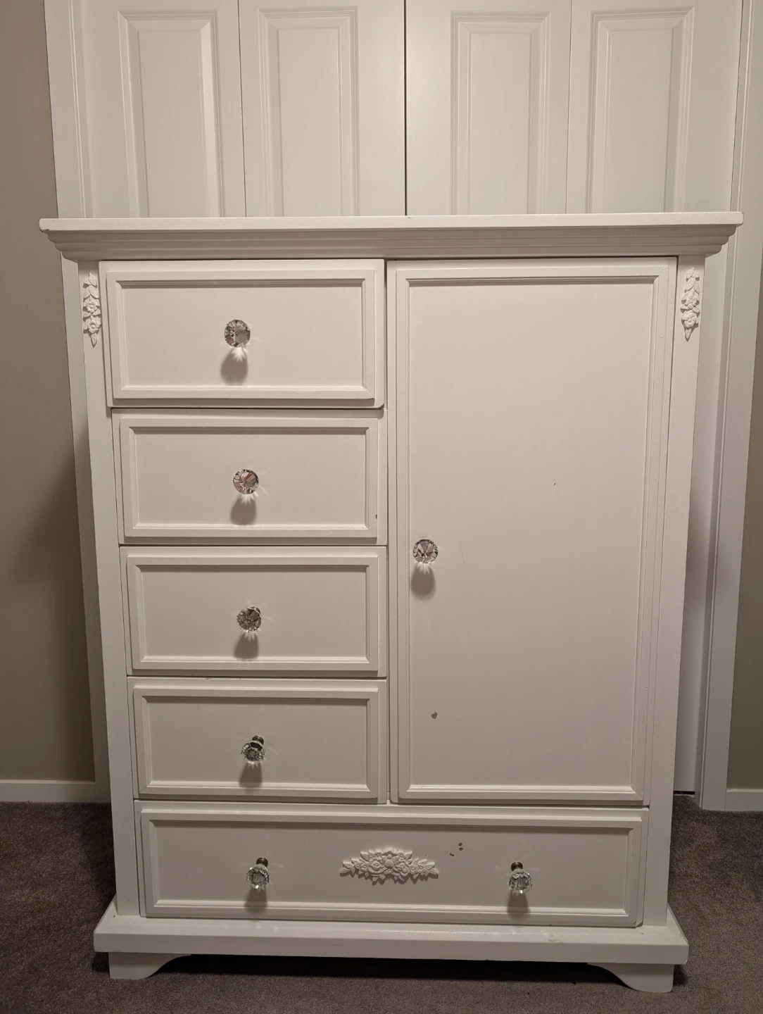 Beautiful white dresser with classic design and crystal-style knobs.