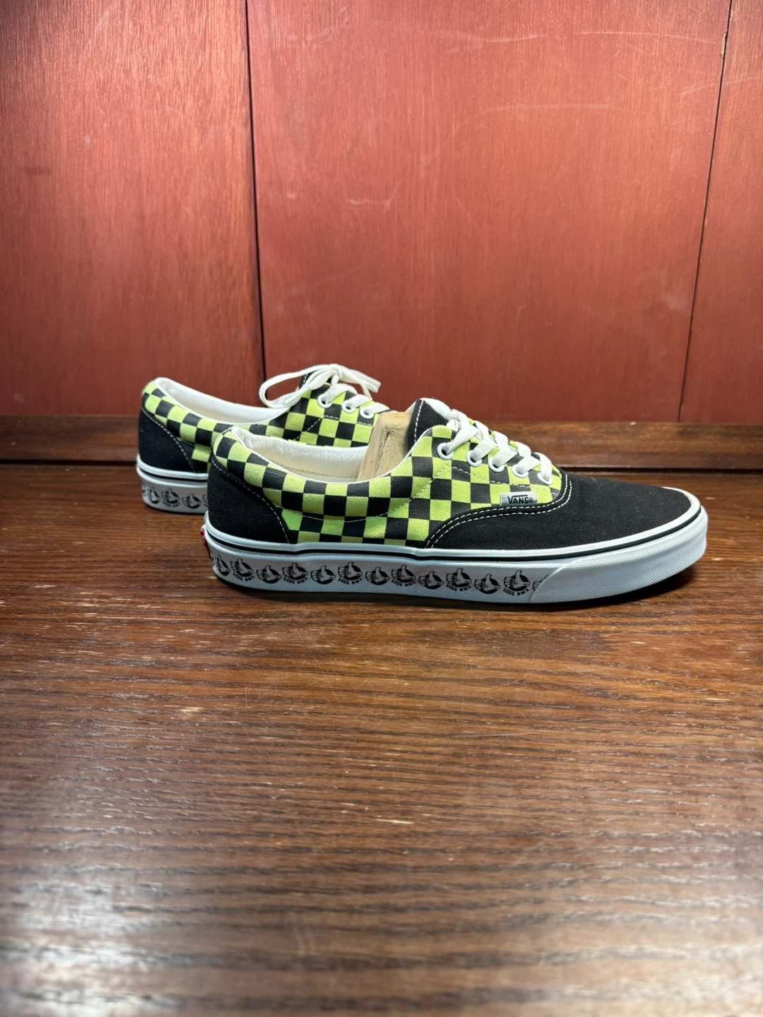 Vans Era low-top skate shoes featuring a lime green and black checkerboard canvas upper with black suede toe and heel panels and skull graphics printed around the foxing.
