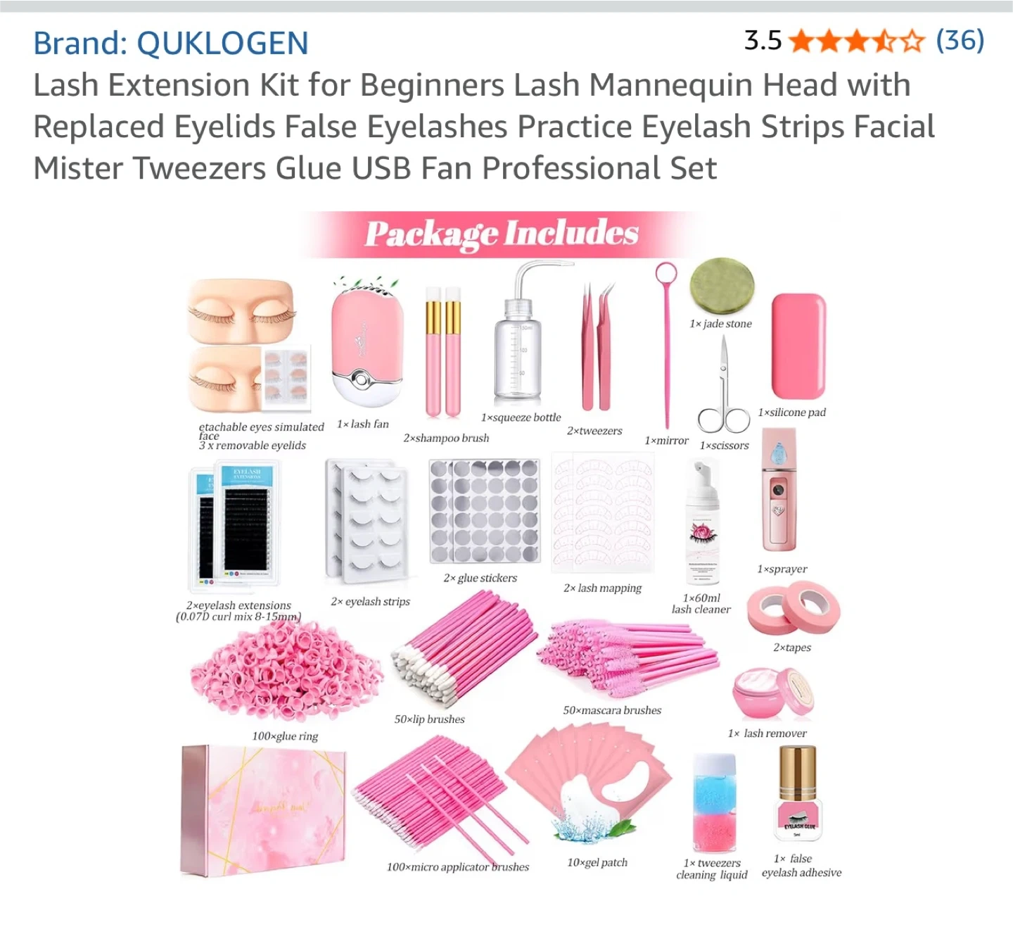 Selling a brand new QUKLOGEN lash extension kit for beginners! It includes a lash mannequin head with replaced eyelids, false eyelashes, practice eyelash strips, a facial mister, tweezers, glue, and a USB fan. The package also includes many items such as: