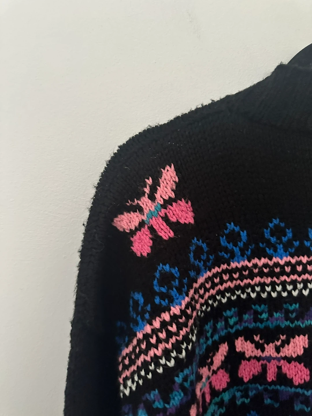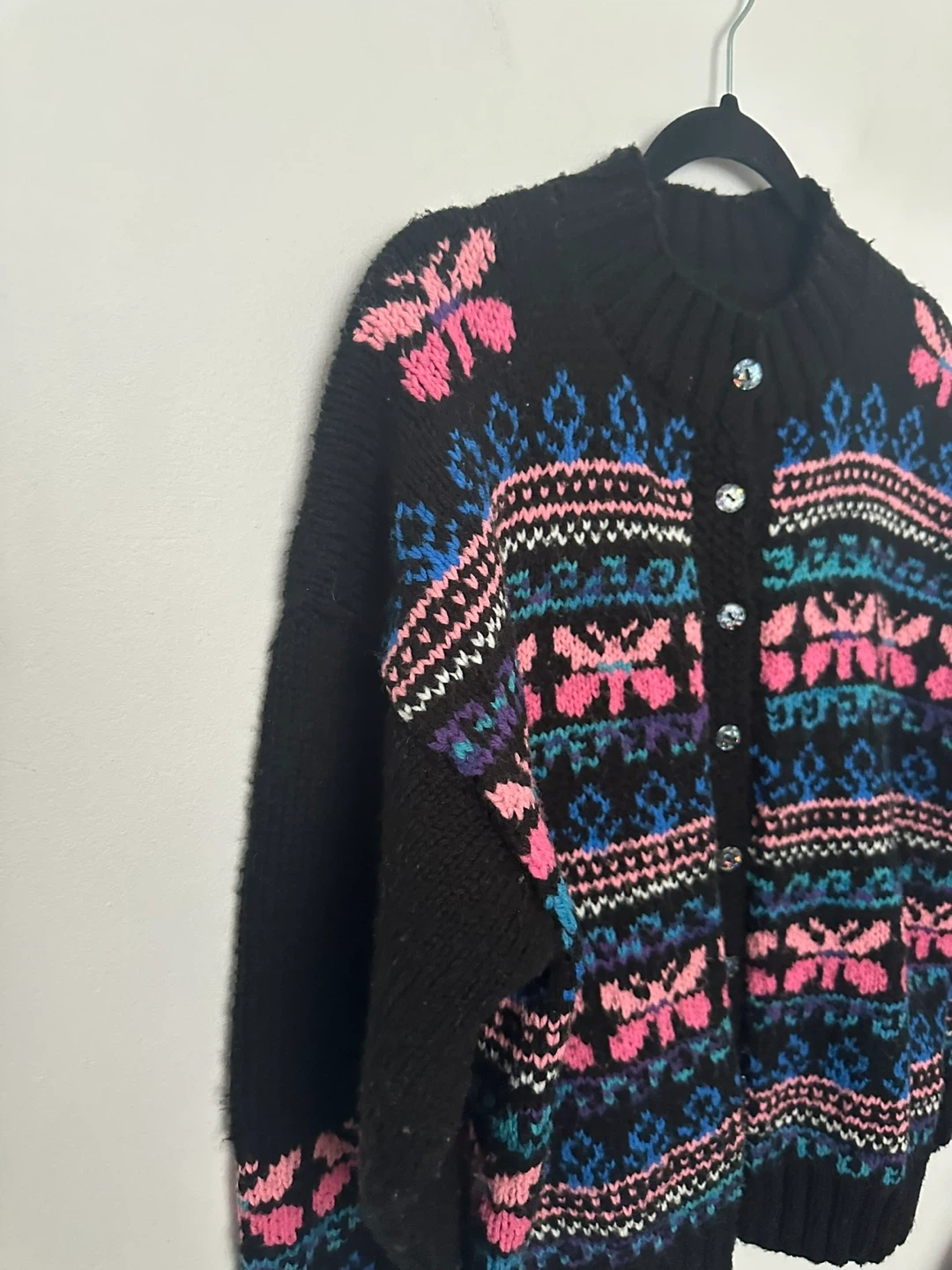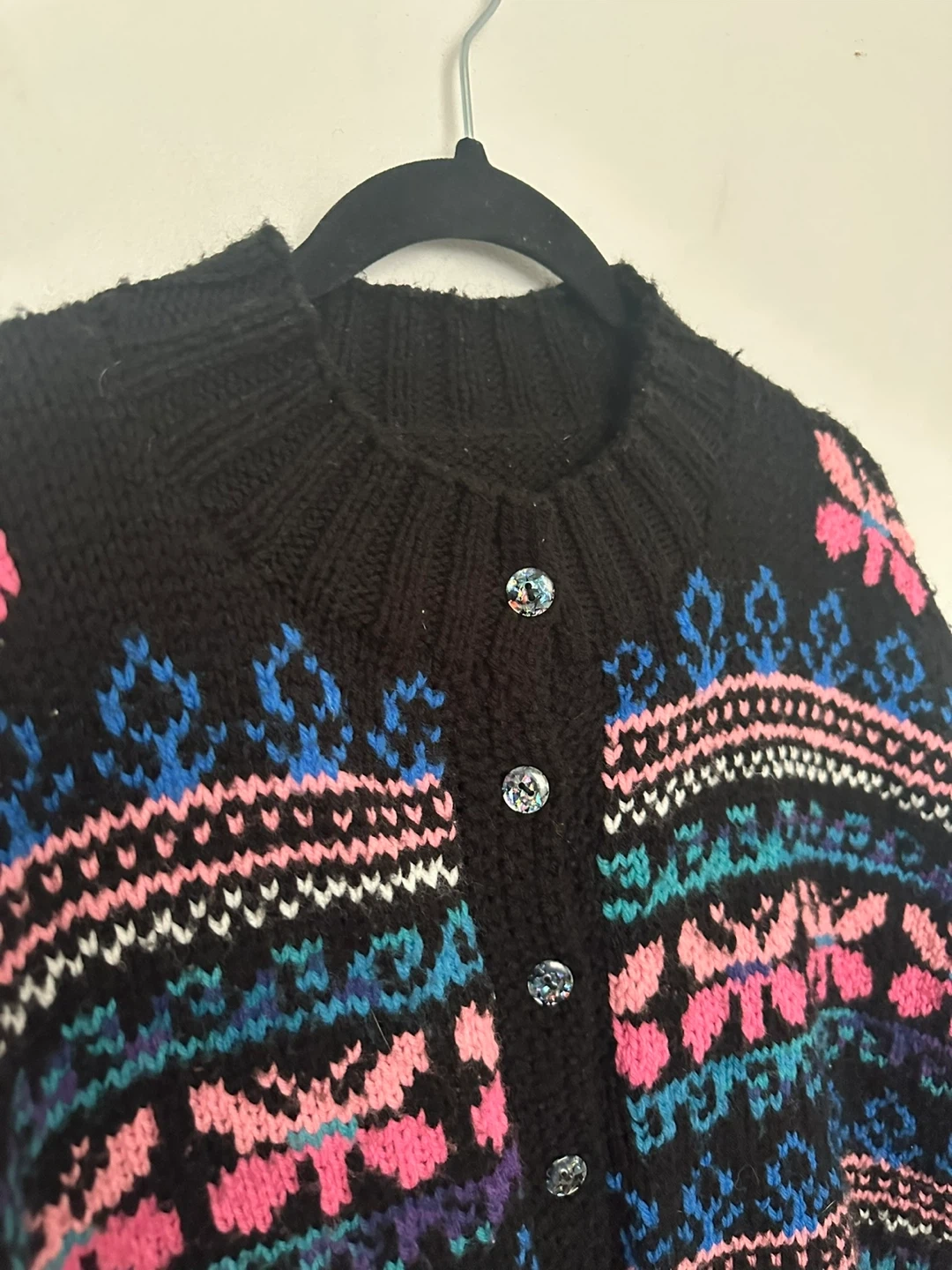 Cozy up in this eye-catching black knit cardigan! It features a colourful patterned design with pink, blue, and purple accents. Perfect for adding a pop of colour to your wardrobe and staying warm on chilly days