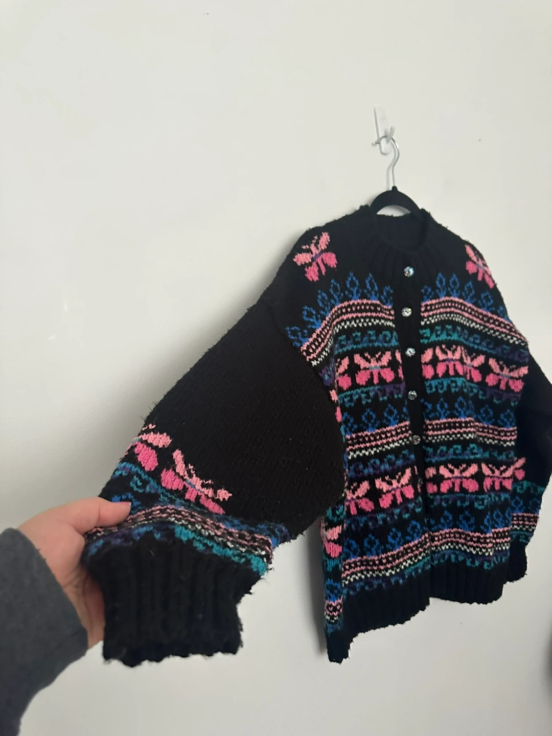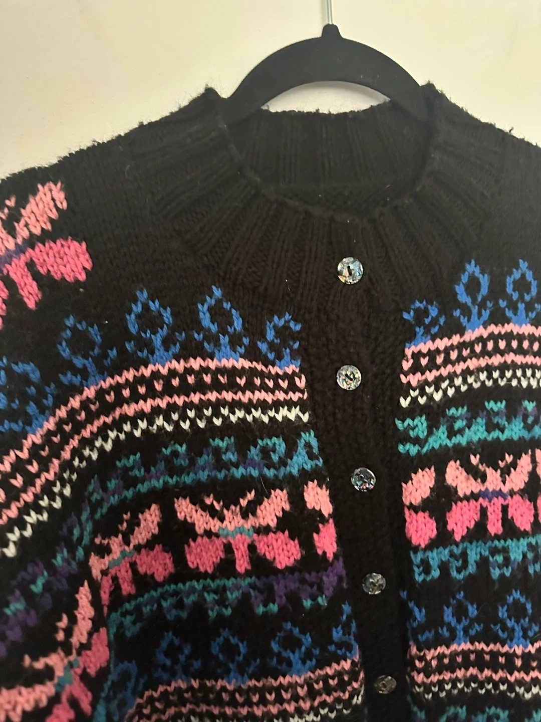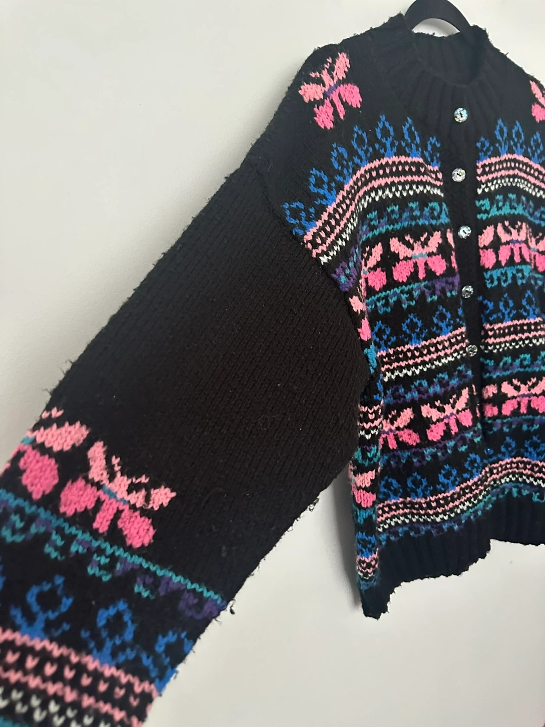 Cozy up in this eye-catching black knit cardigan! It features a colourful patterned design with pink, blue, and purple accents. Perfect for adding a pop of colour to your wardrobe and staying warm on chilly days