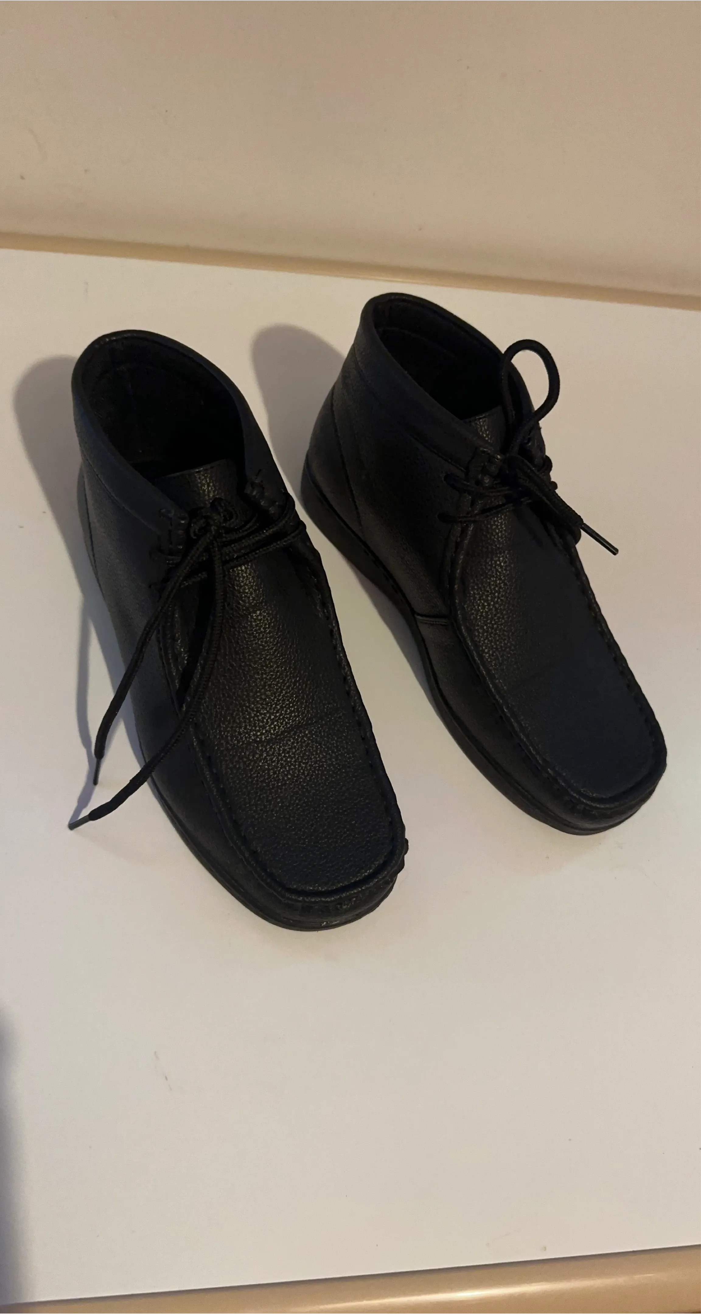 These are a pair of black leather chukka boots. They have a lace-up closure and a classic design. They appear to be in good condition with minimal signs of wear.