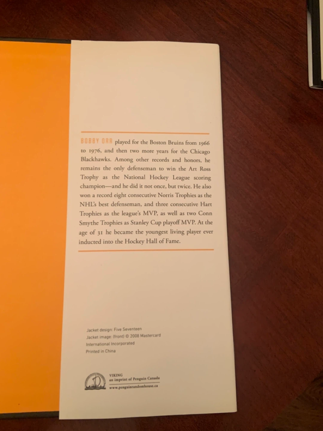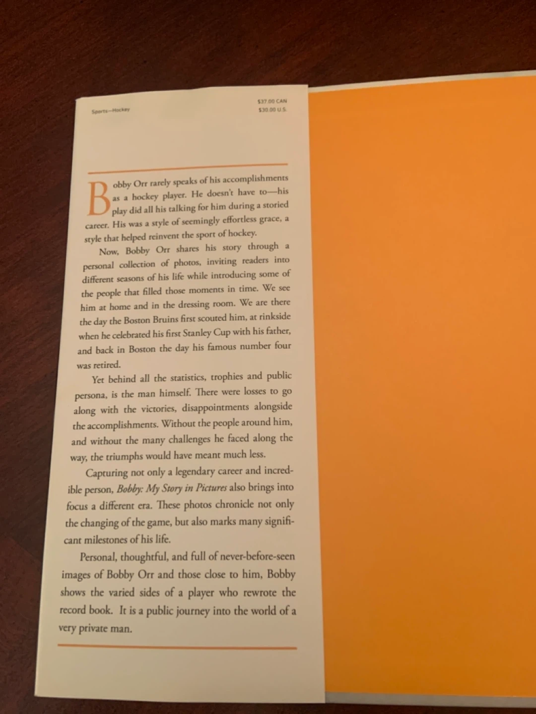 Selling a copy of "Bobby Orr: My Story in Pictures". It's a personal collection of photos chronicling Bobby Orr's life and career, including moments with the Boston Bruins and his journey to becoming a hockey legend. The book also touches on the challenges and triumphs he faced throughout his career