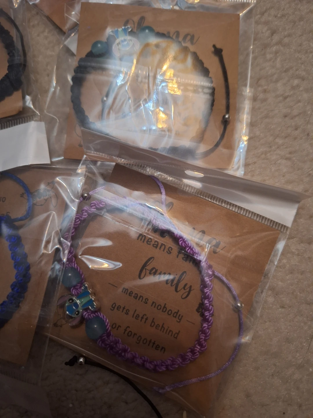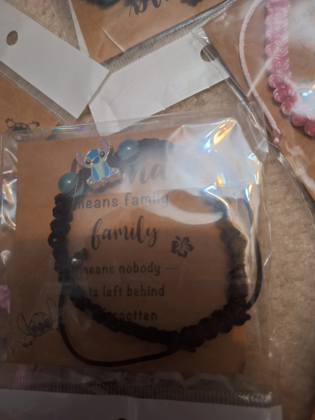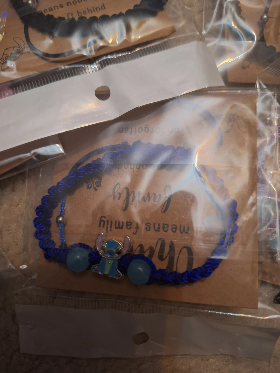 I have cute family or friendship Stitch charm bracelets for sale! These cute bracelets come in a variety of colours; blue, purple, pink or black. They're perfect as a gift or for yourself!