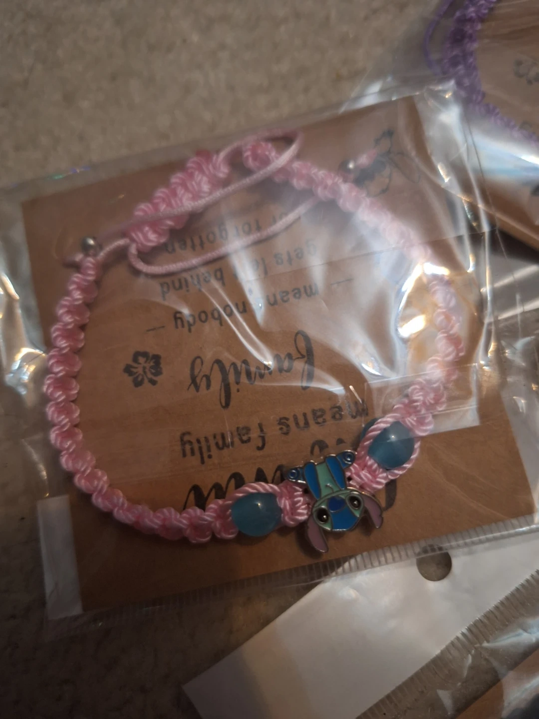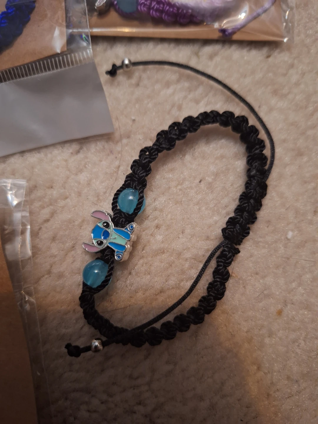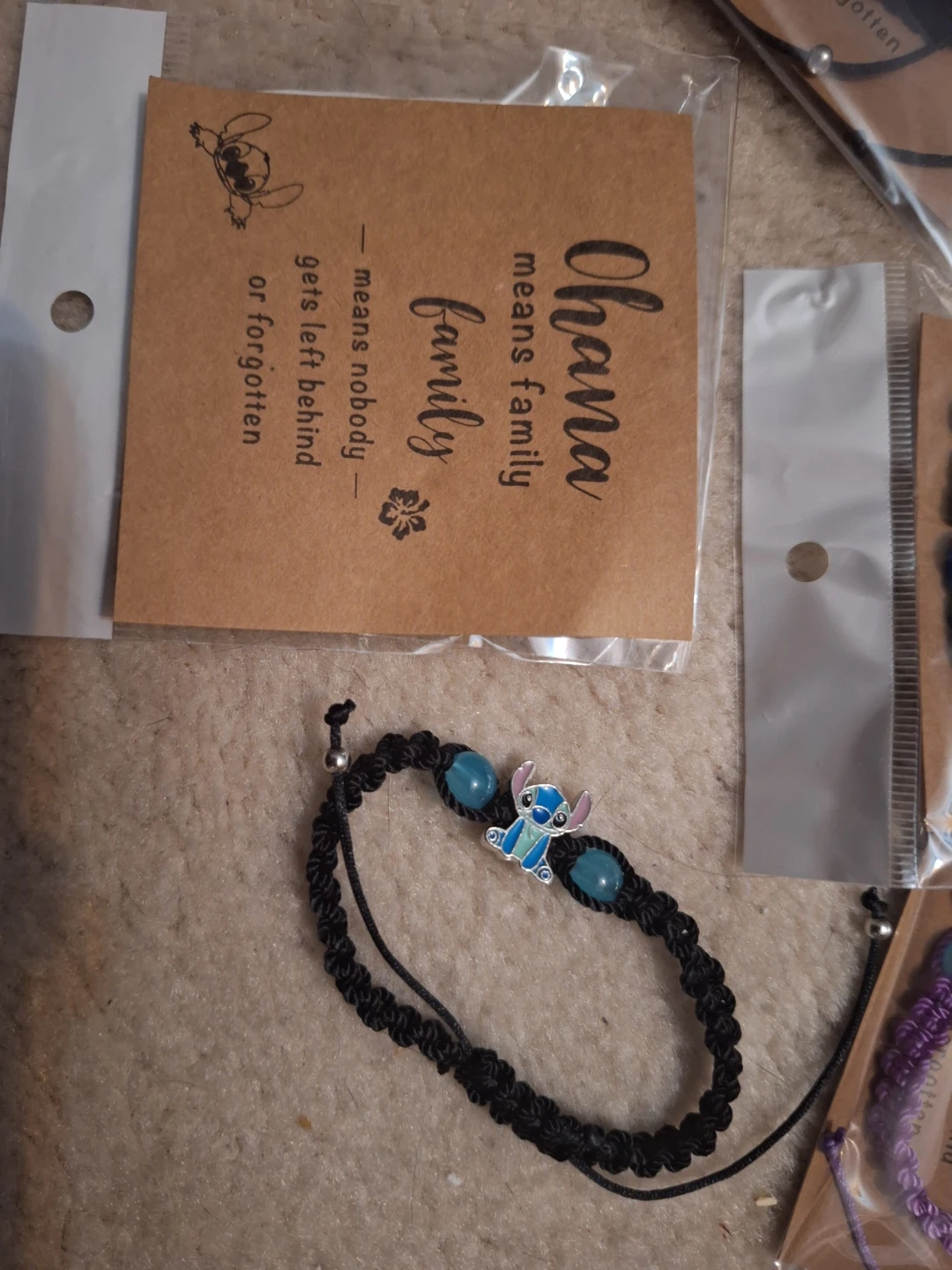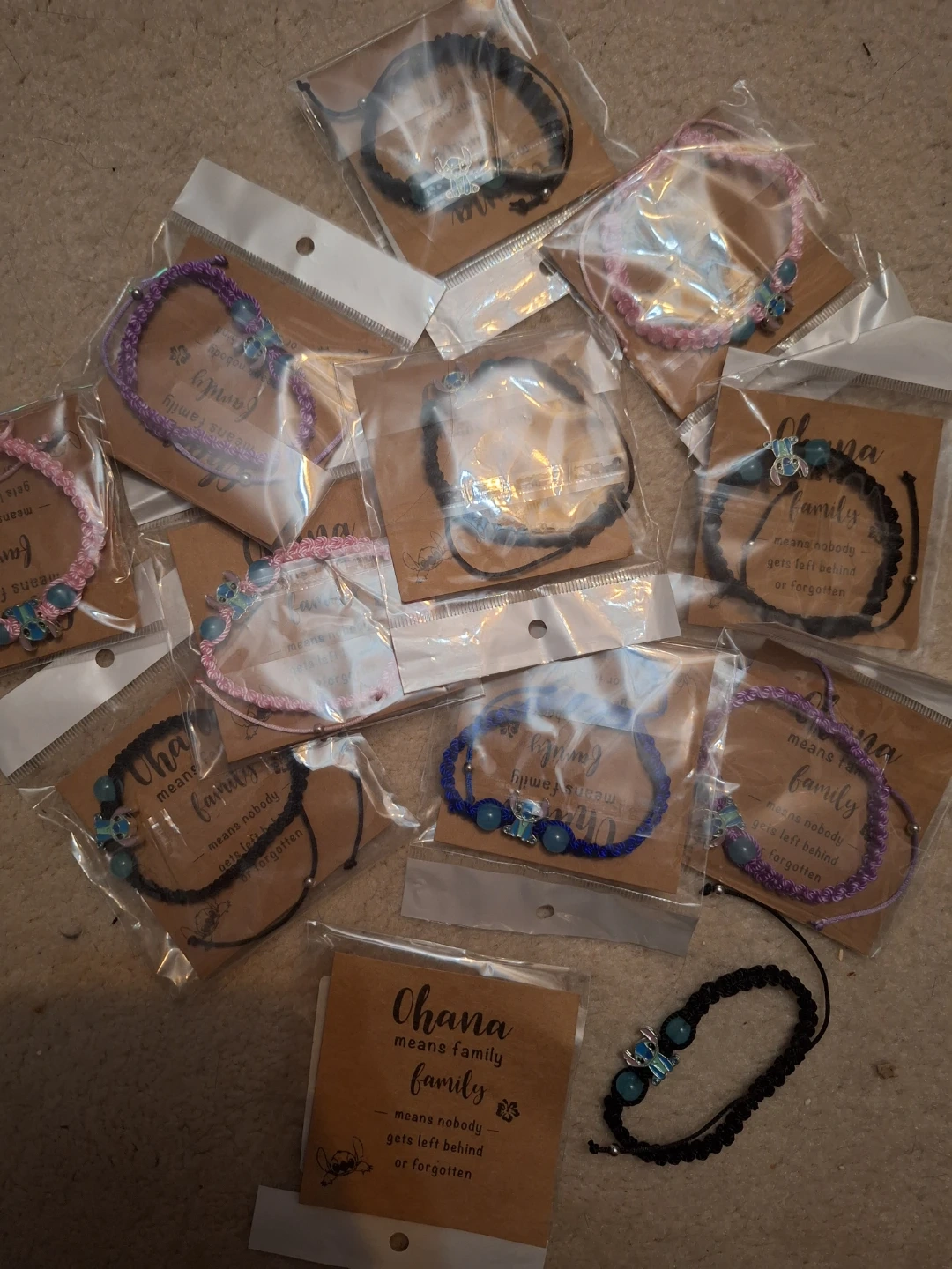 I have cute family or friendship Stitch charm bracelets for sale! These cute bracelets come in a variety of colours; blue, purple, pink or black. They're perfect as a gift or for yourself!