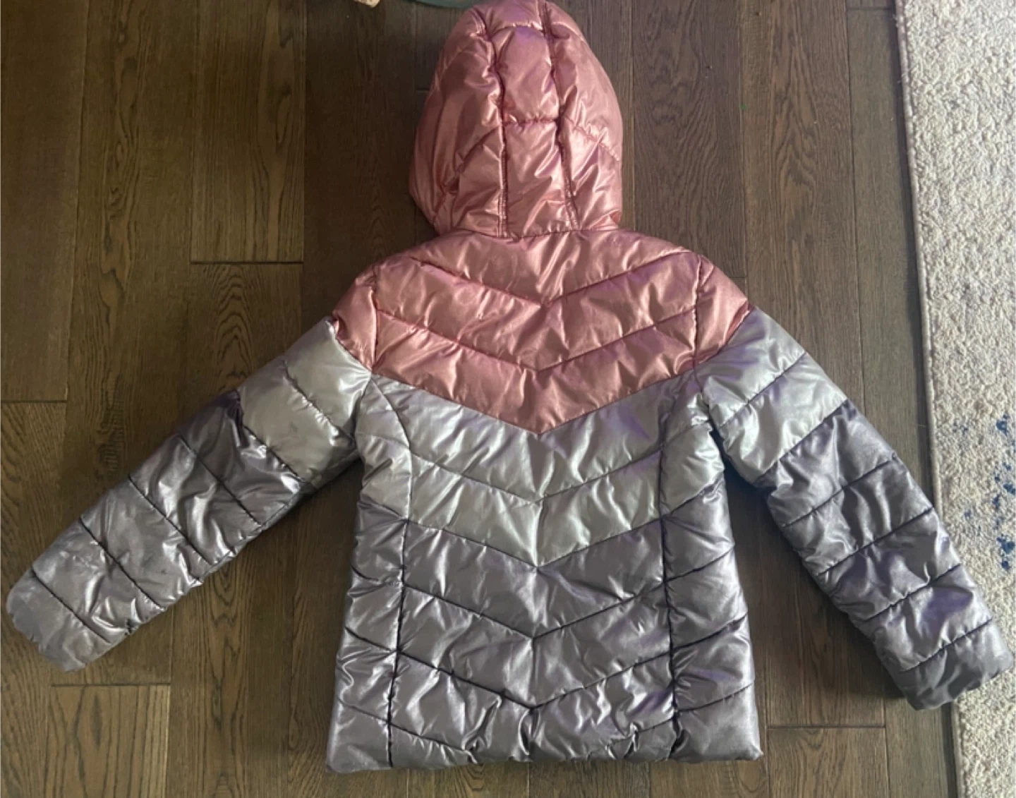 Here's a cute shiny hooded puffer jacket from The Children's Place! It's a size L (10/12) and features a stylish colour block chevron design in silver and pink. Perfect for keeping your little one warm and cozy! Great condition and smk-free. Pick up north end near Linwell/Vine