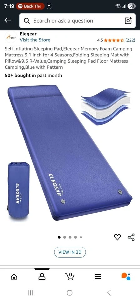 Overmont self inflating camping mattress with built in pillow 77x27x3inch $40