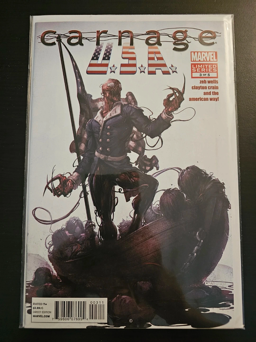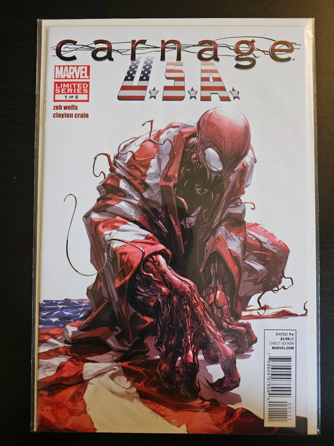 Up for grabs is a complete set of Carnage USA comics, issues 1-5! These comics are in used condition, showing some wear and tear, but are still very readable and displayable. Perfect for any collector or fan of the Carnage character! These comics have been kept in a smoke free home.