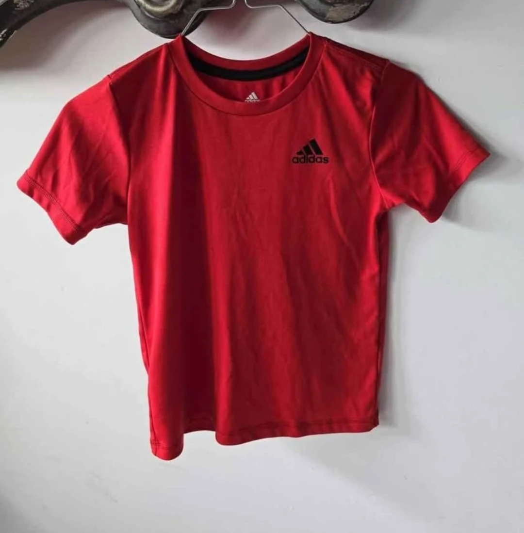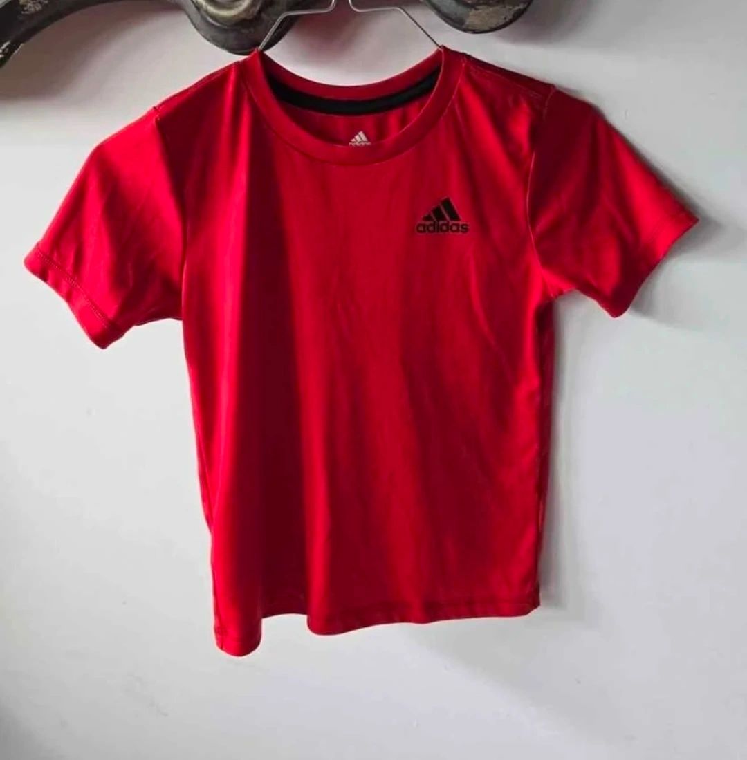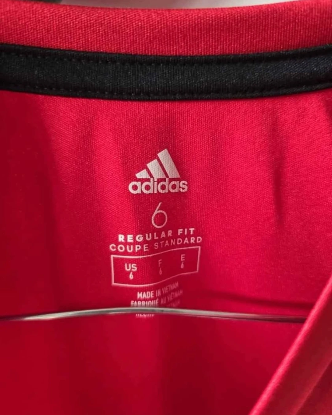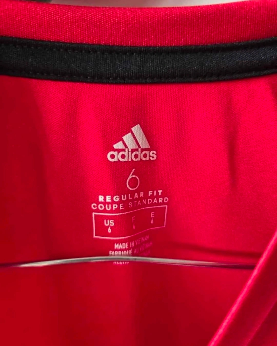 A red Adidas t-shirt in size 6. The shirt has a regular fit and is in great condition. It's perfect for everyday wear or sports activities!