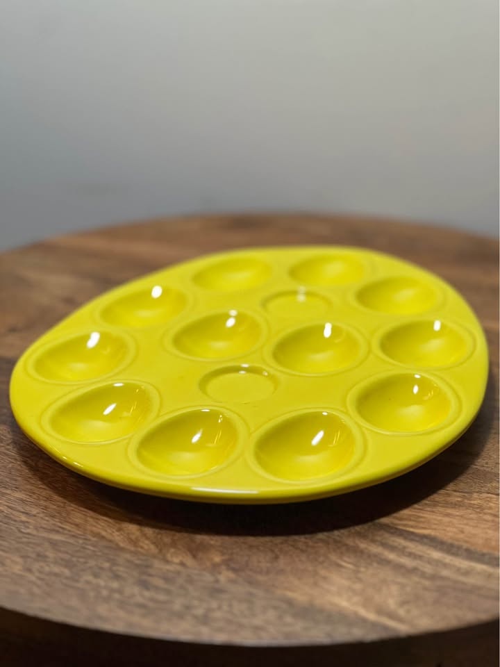 This ceramic egg holder tray is designed to hold and serve 12 deviled eggs with elegance. Its vibrant yellow color adds a cheerful touch to your kitchen decor.