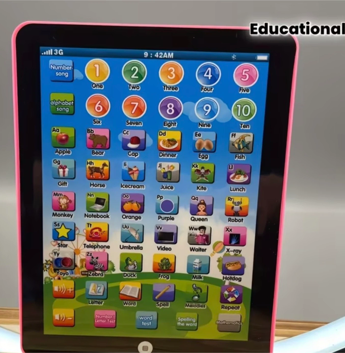 I'm selling an educational learning tablet for kids. It features number songs, alphabet songs, and interactive games to help children learn. It has a blue border and a variety of colourful icons for different words and concepts. It's a fun and engaging way for kids to learn!