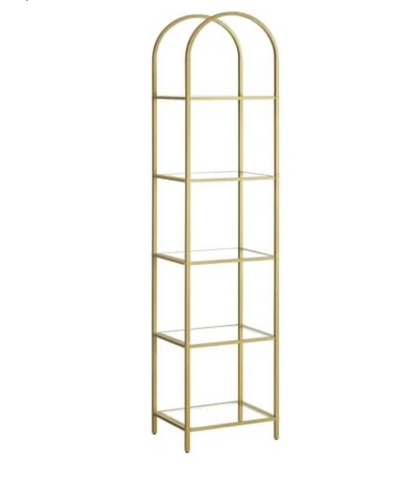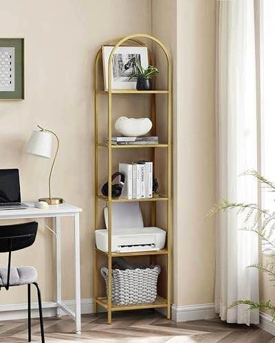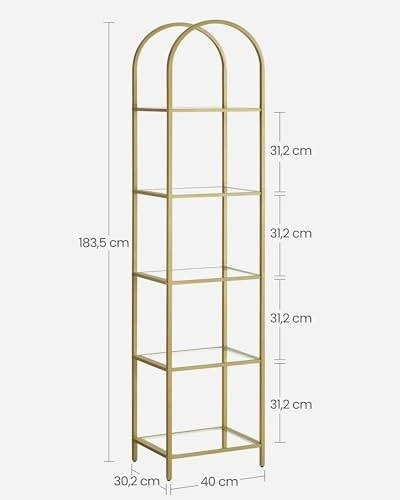 Elegant VASAGLE 5-tier shelf with tempered glass and a sleek arched design. Strong steel frame, perfect for the living room, bedroom, office, or bathroom.