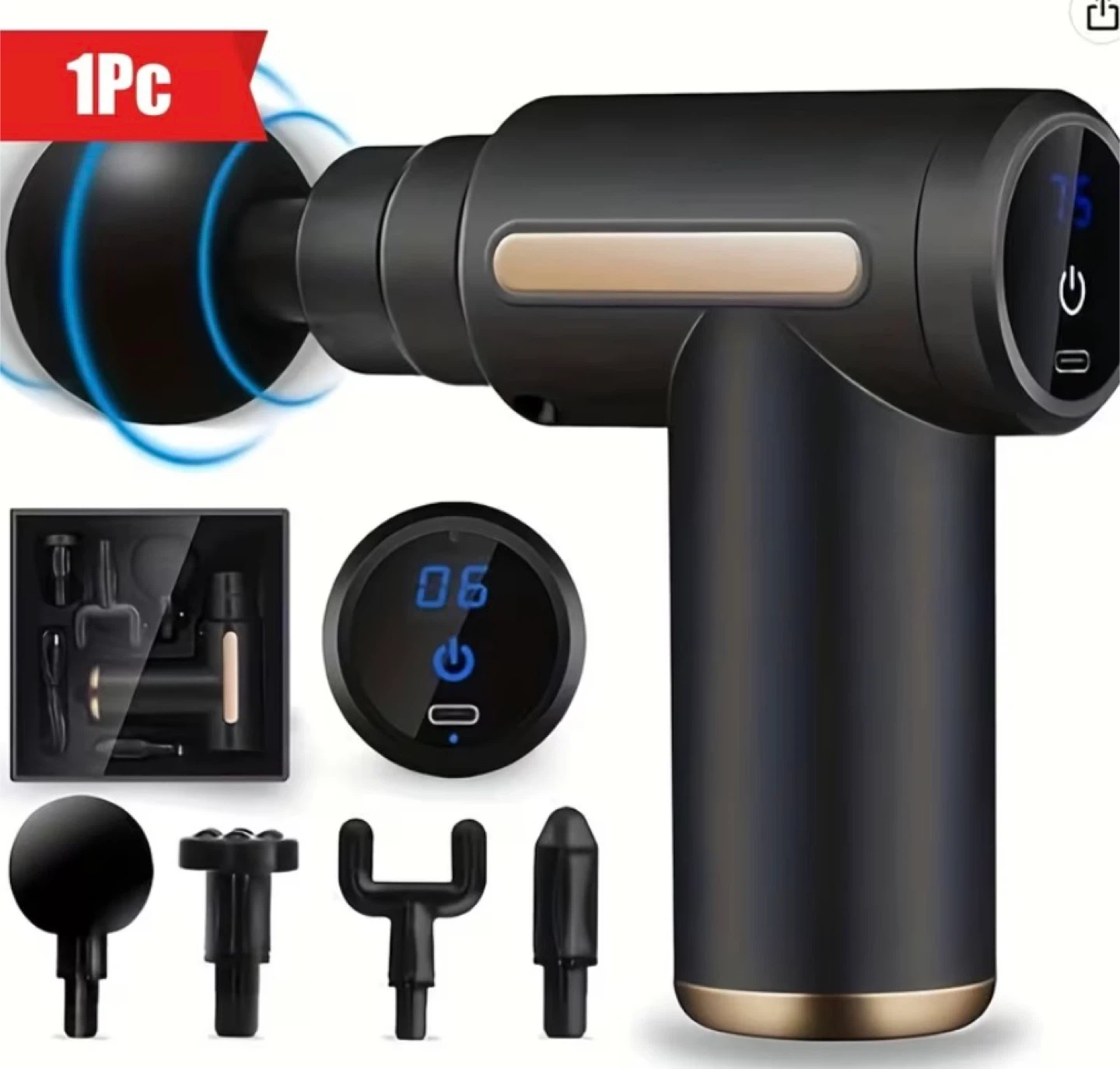 I'm selling a massage gun that comes with multiple attachments. It looks like it's in great condition and includes its original box! Perfect for easing those sore muscles after a workout or a long day
