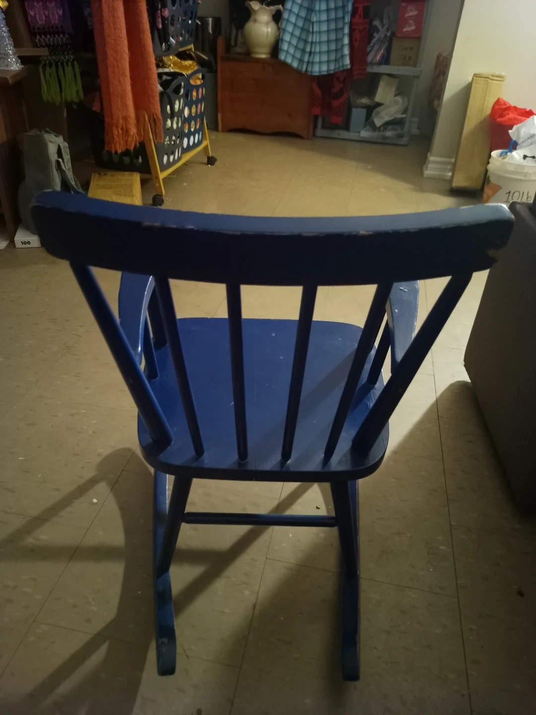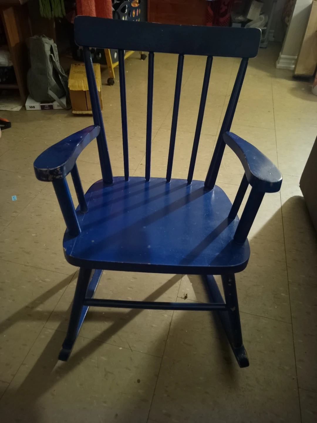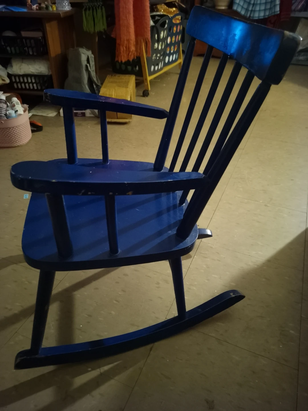 Here's a charming blue wooden rocking chair! It's perfect for relaxing and adding a touch of classic style to any room. It has some signs of wear.