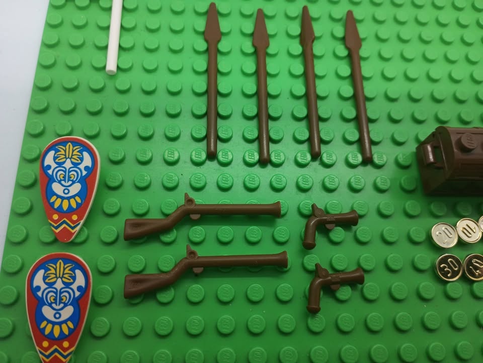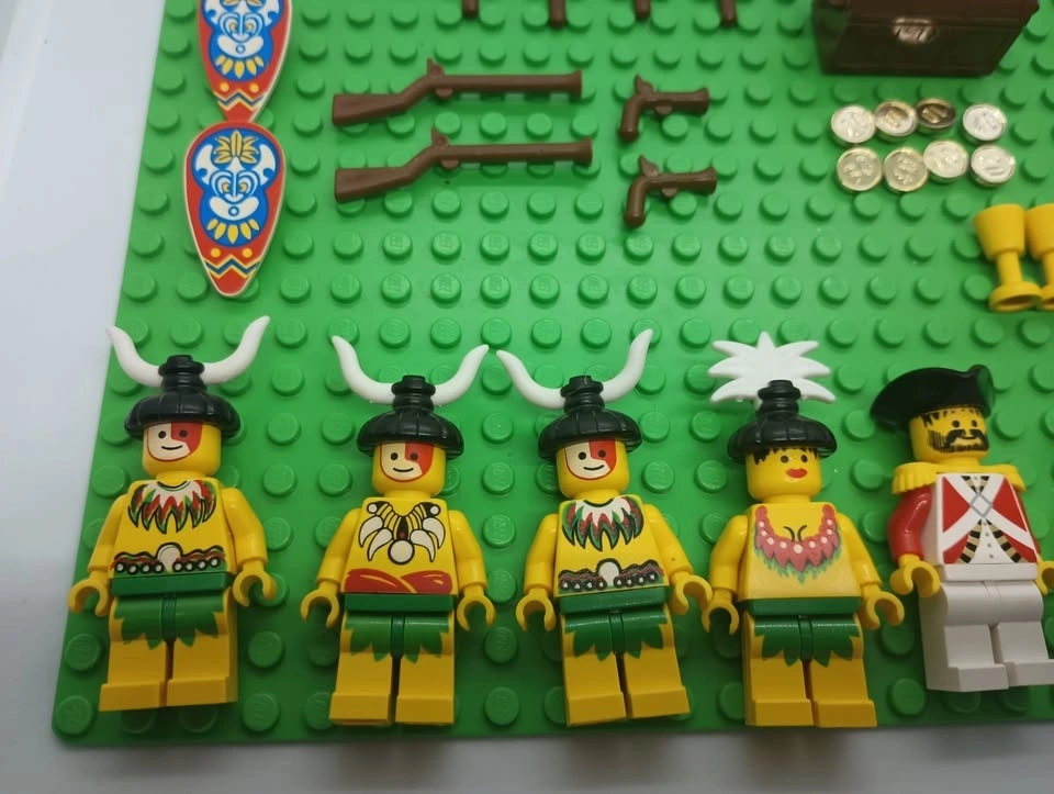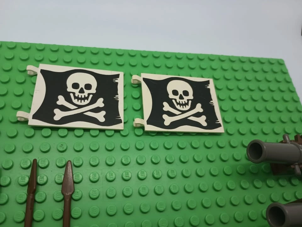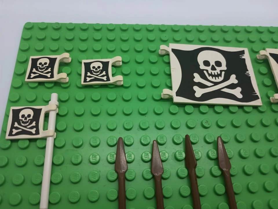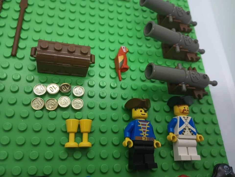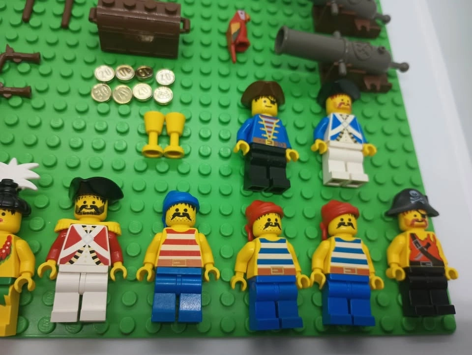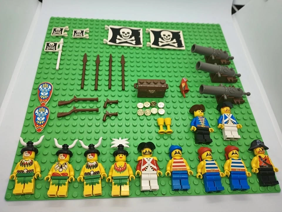 Lot of vintage Lego pirate minifigs and other Lego pirate pieces including cannons, treasure chest, coins, spears, muskets and flags. From a SF/BF home in Charleswood.