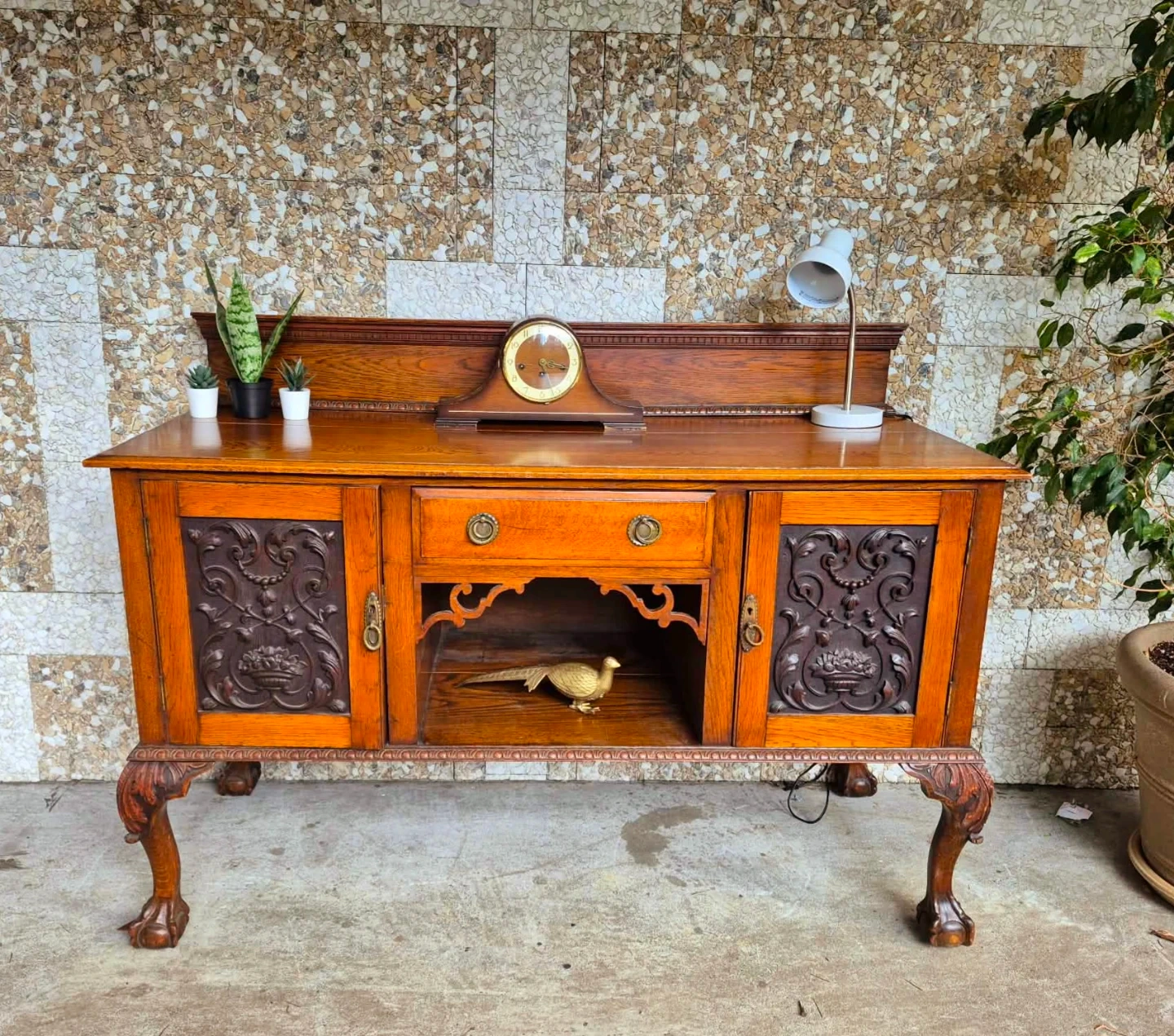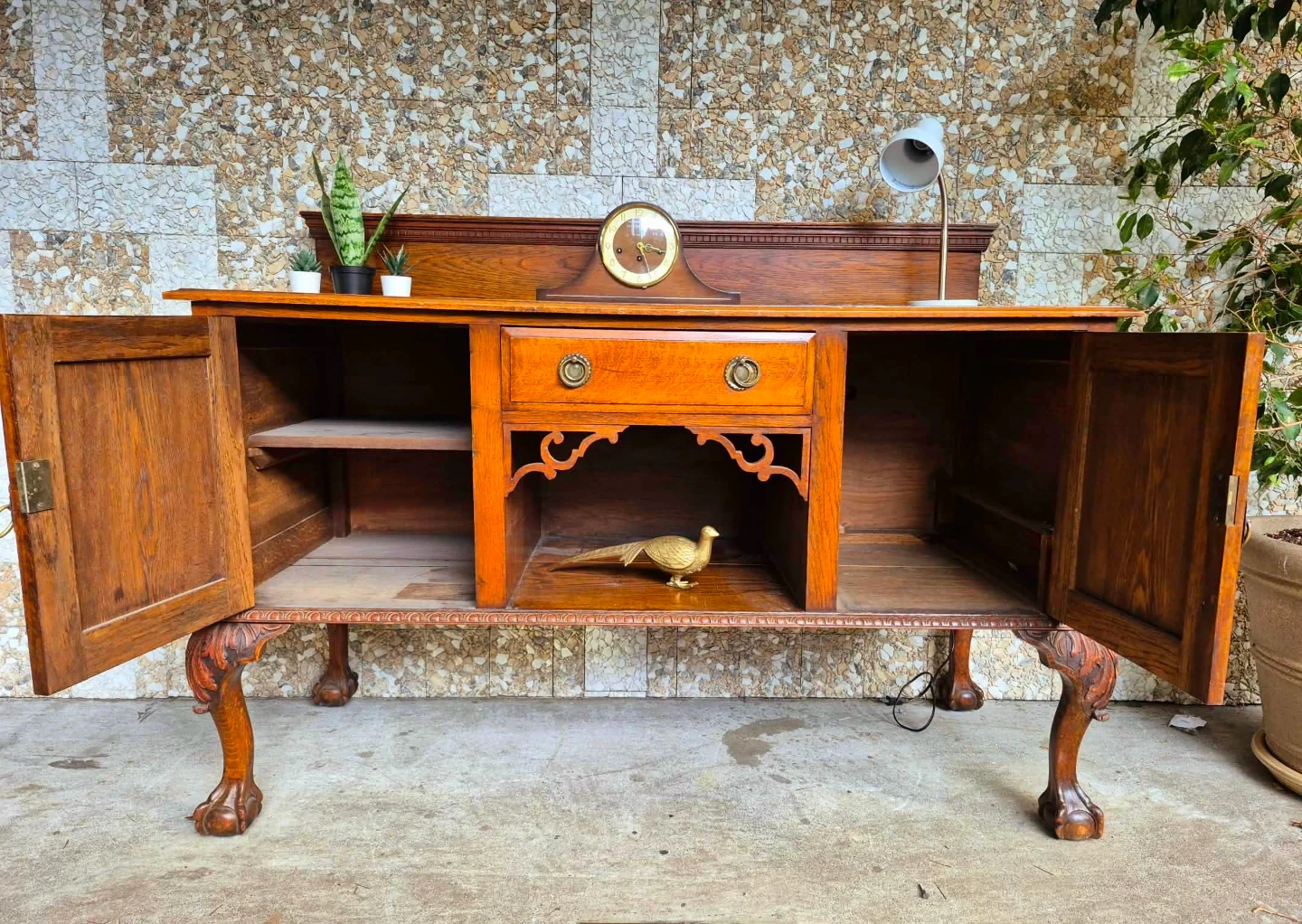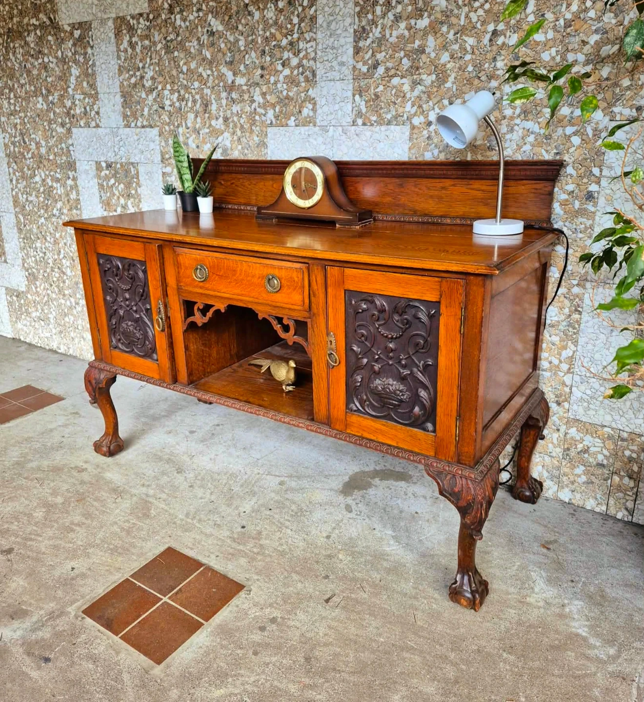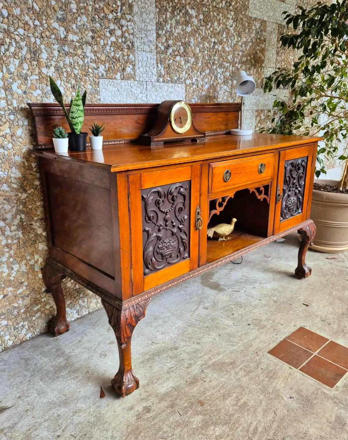 Beautiful antique solid wood sideboard featuring rich wood tones intricate carved panel doors and elegant claw feet.