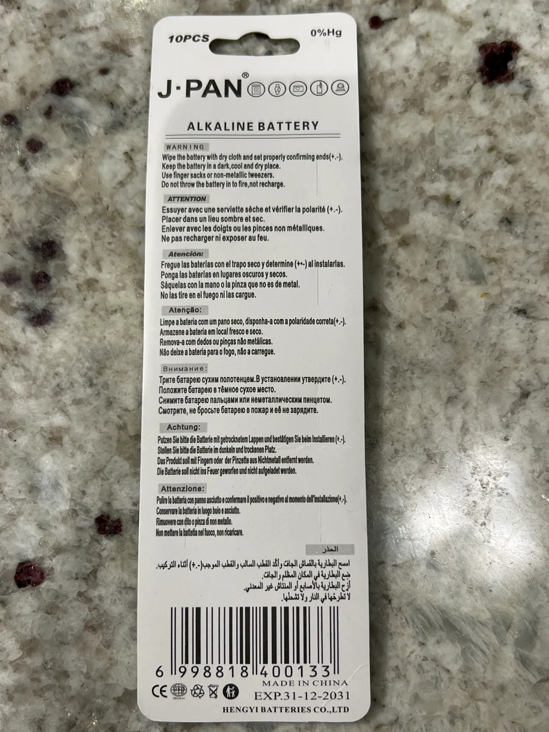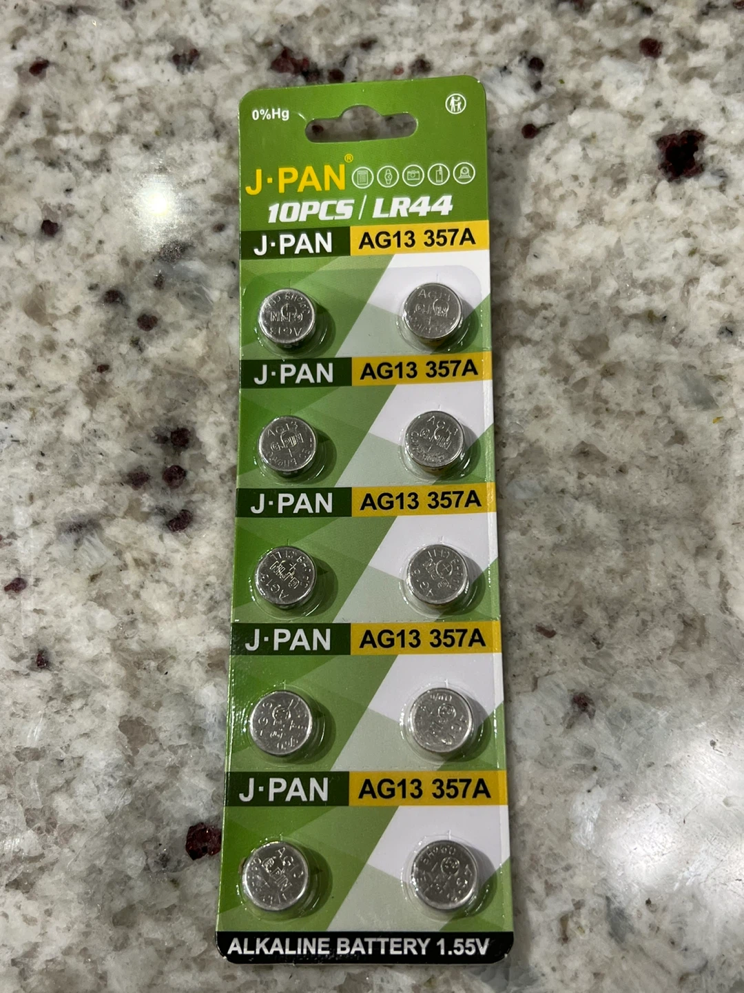 I'm selling a pack of 10 brand new J-Pan LR44 AG13 357A alkaline batteries. They are 1.55V and ready to use. The Expiry date is 2031 December 31.