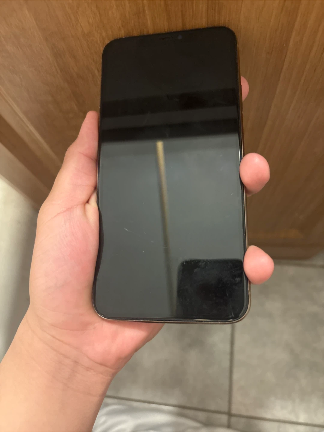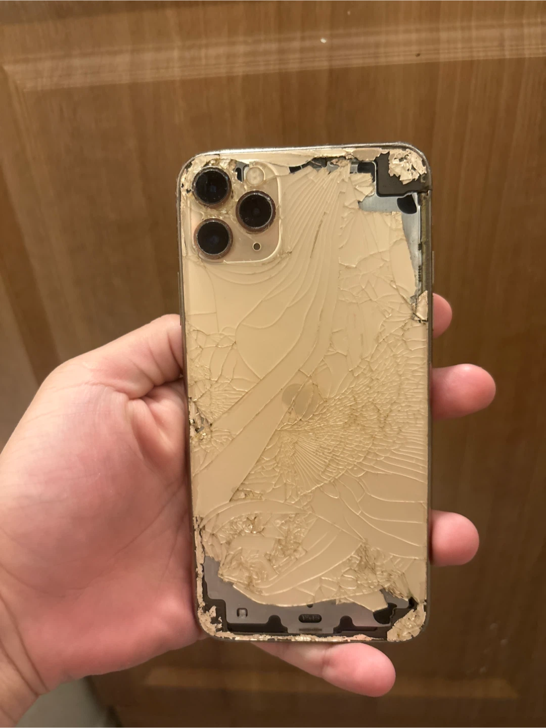 Selling a used iPhone 11 Pro Max in gold. It is damaged. does not turn on only good for parts, if you replace the screen the phone would work