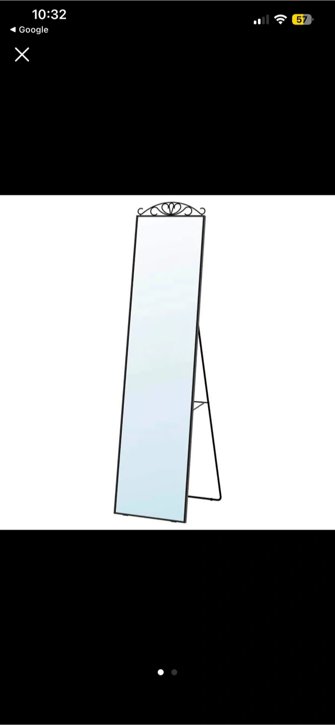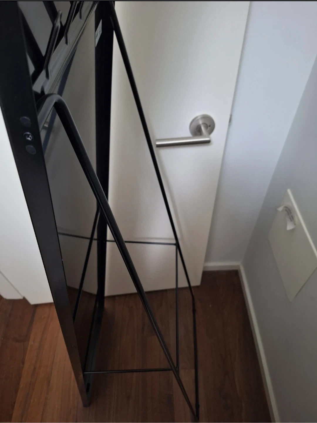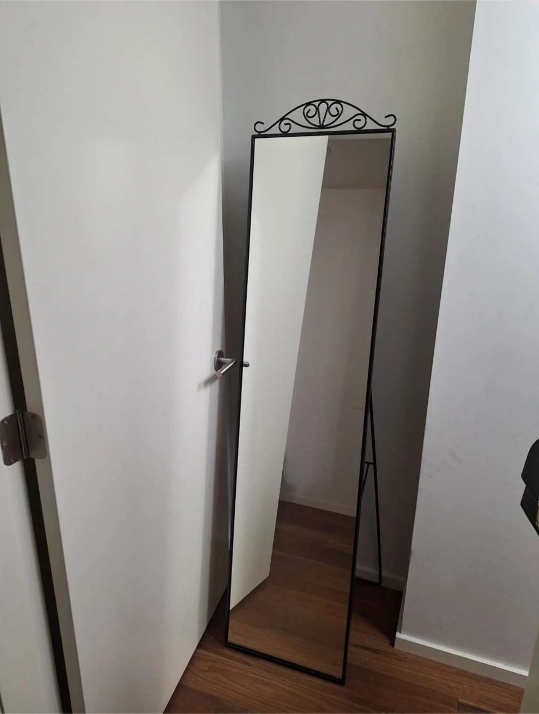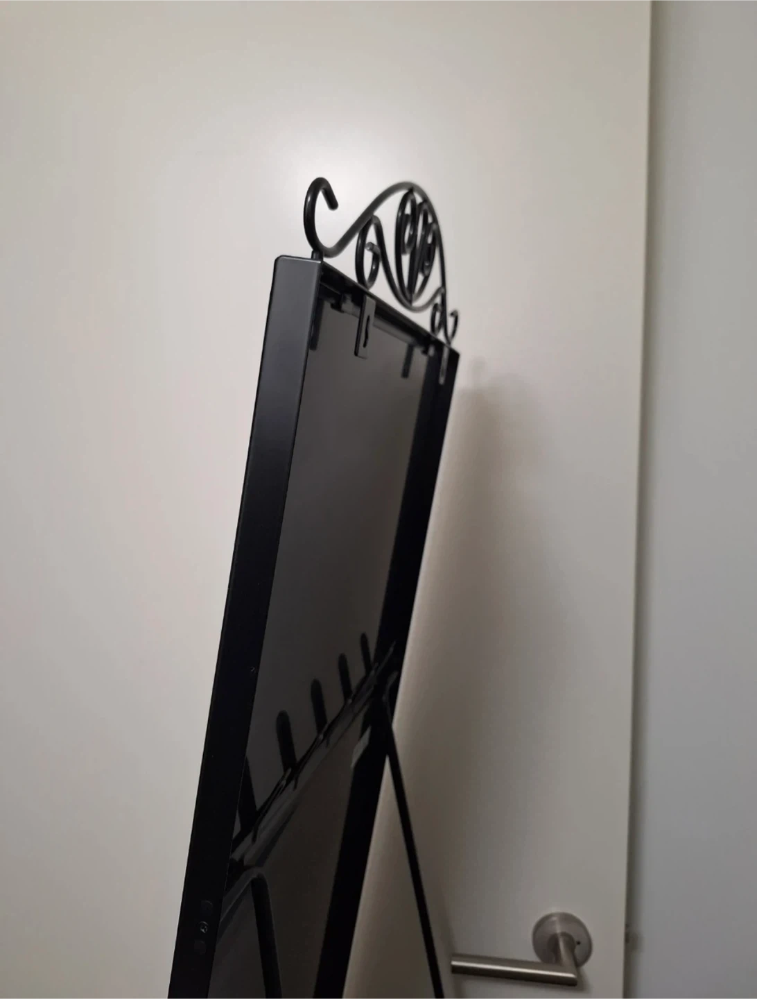 Here's a full-length standing mirror with a sleek black metal frame. It's perfect for checking out your outfit before heading out the door! The mirror has hooks for clothes/jewelry and a sturdy stand at the back.