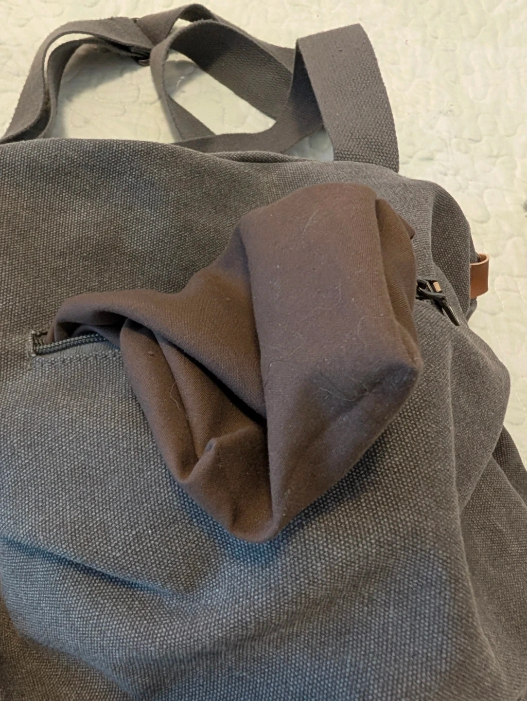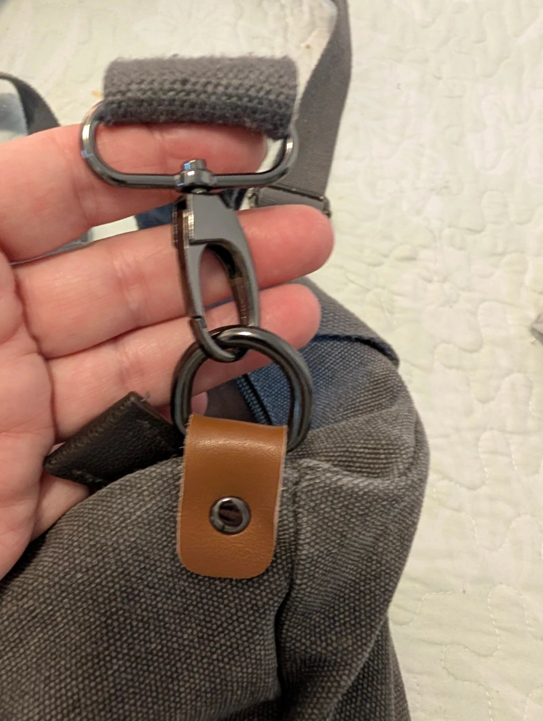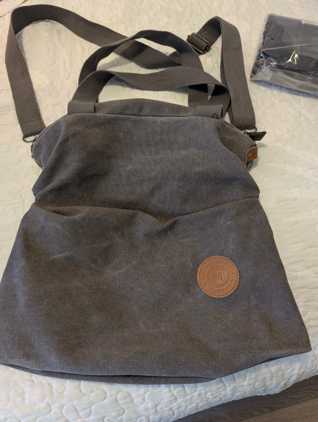 Here's a Myhozoee canvas crossbody bag in a neutral grey colour. It's in great condition and has a nice, casual look. Perfect for everyday use!