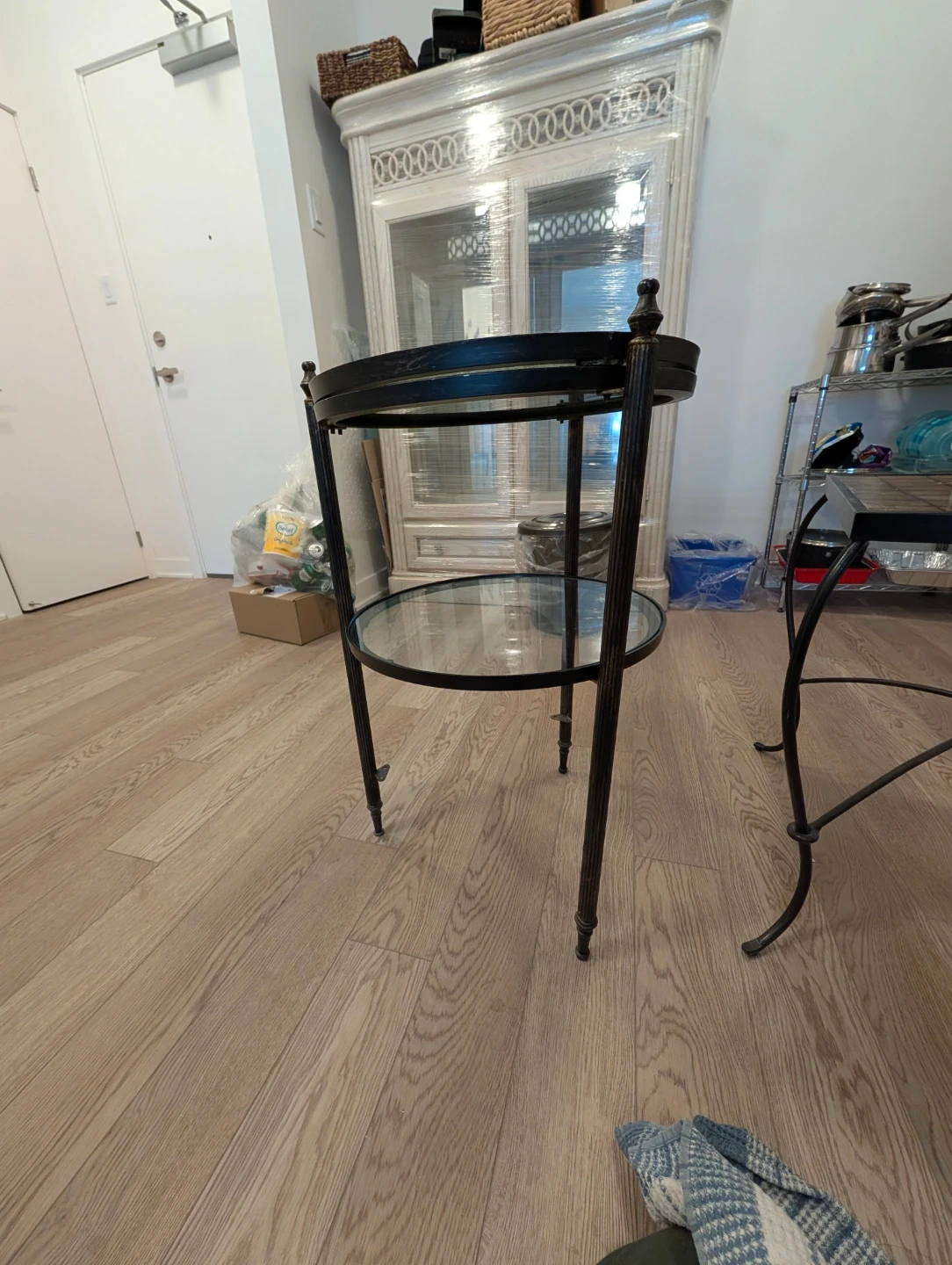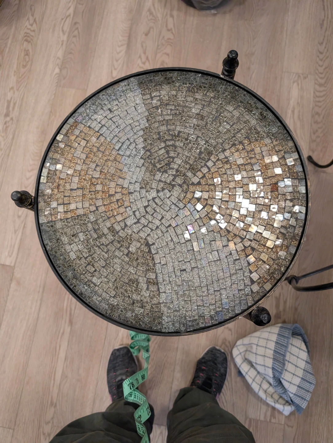 This is a cute round side table with a mosaic tile top and a lower glass shelf. It has black metal legs. It would look great in any room!