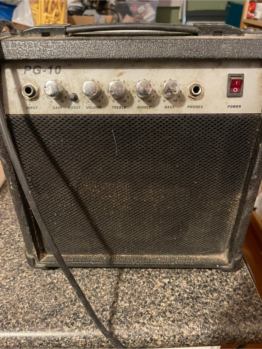 FREE a PG-10 guitar amplifier. It has inputs for gain, boost, volume, treble, middle, and bass. Also includes a headphone jack and power switch. It's a great little amp!