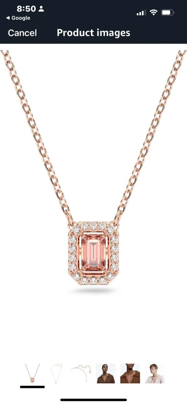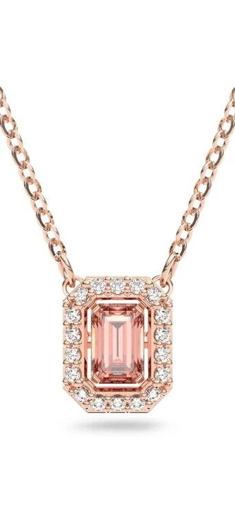 This is a beautiful Swarovski Millenia pendant in a lovely pink colour with a rose gold tone finish. It's a stunning piece that would make a great addition to any jewellery collection.