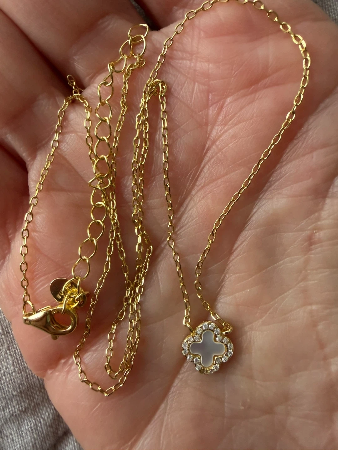 Selling a lovely gold necklace with a clover pendant. The clover is white with a ring of clear stones around it. It's in great condition and would make a beautiful addition to any outfit