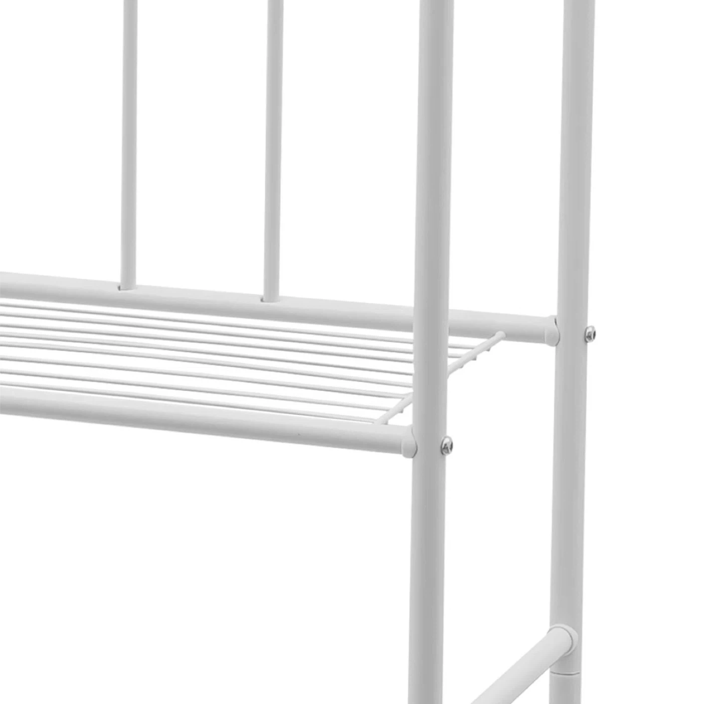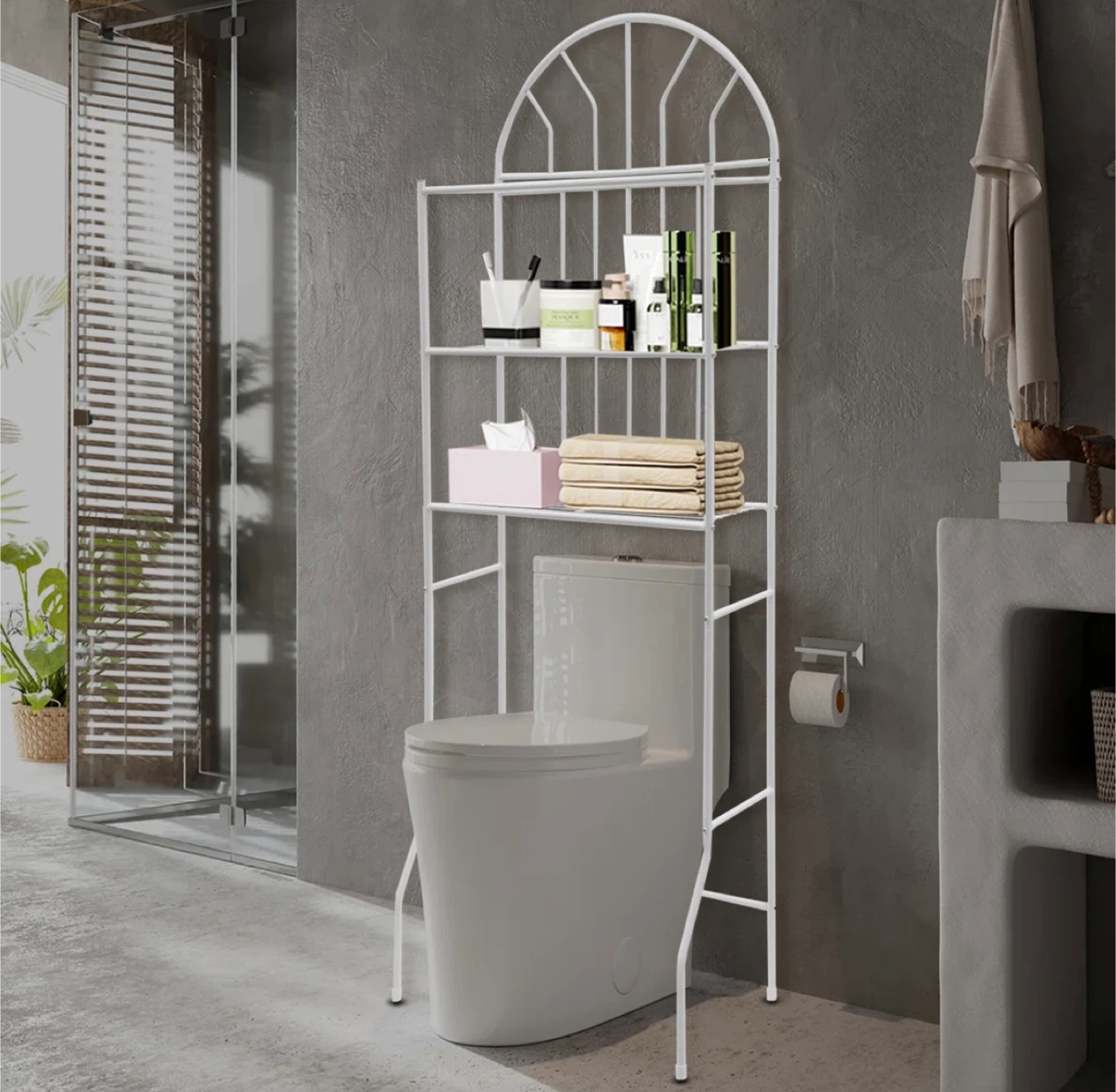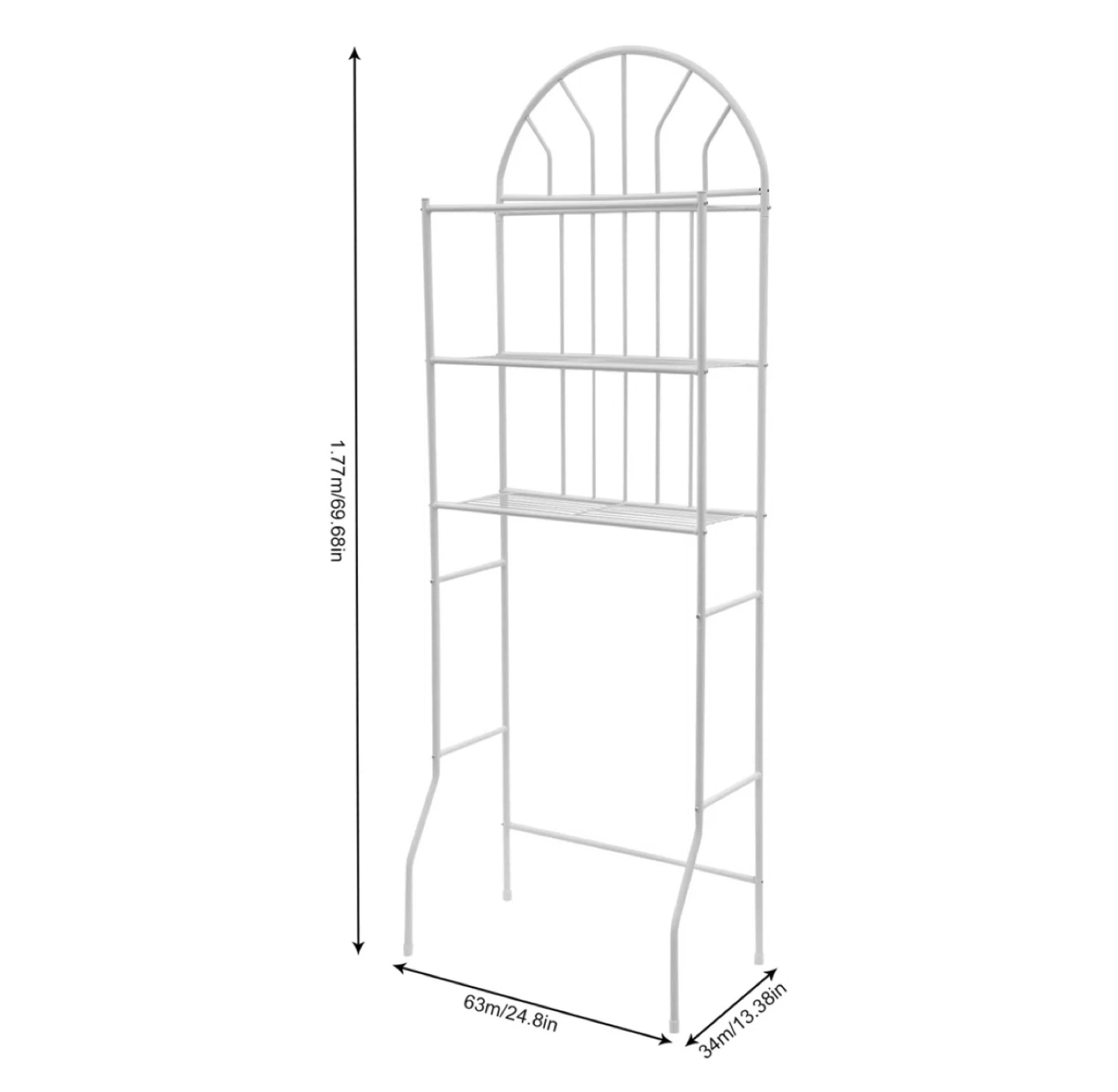 This white over-the-toilet storage shelf is a great way to maximize space in your bathroom! Brand new in box. Material is metal.