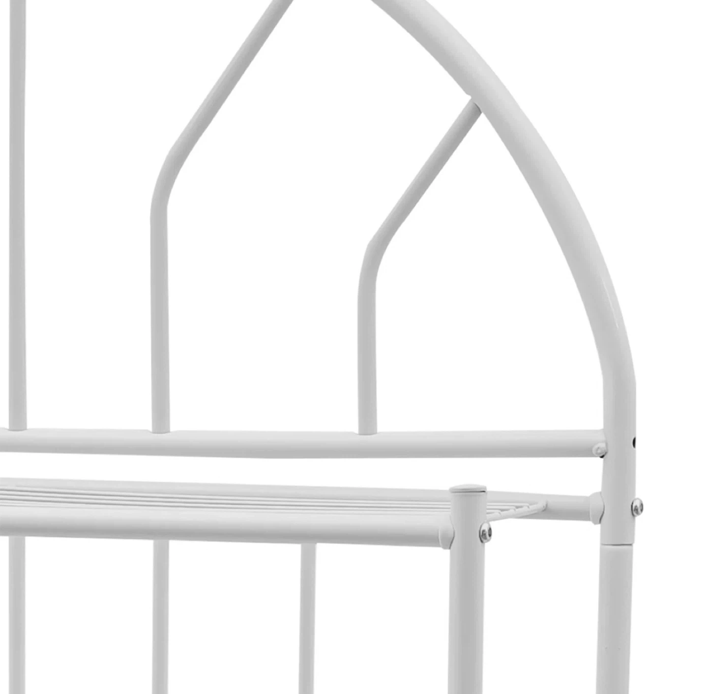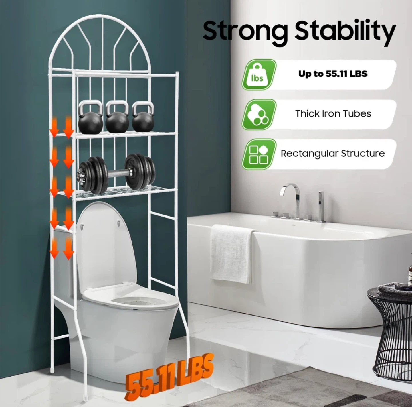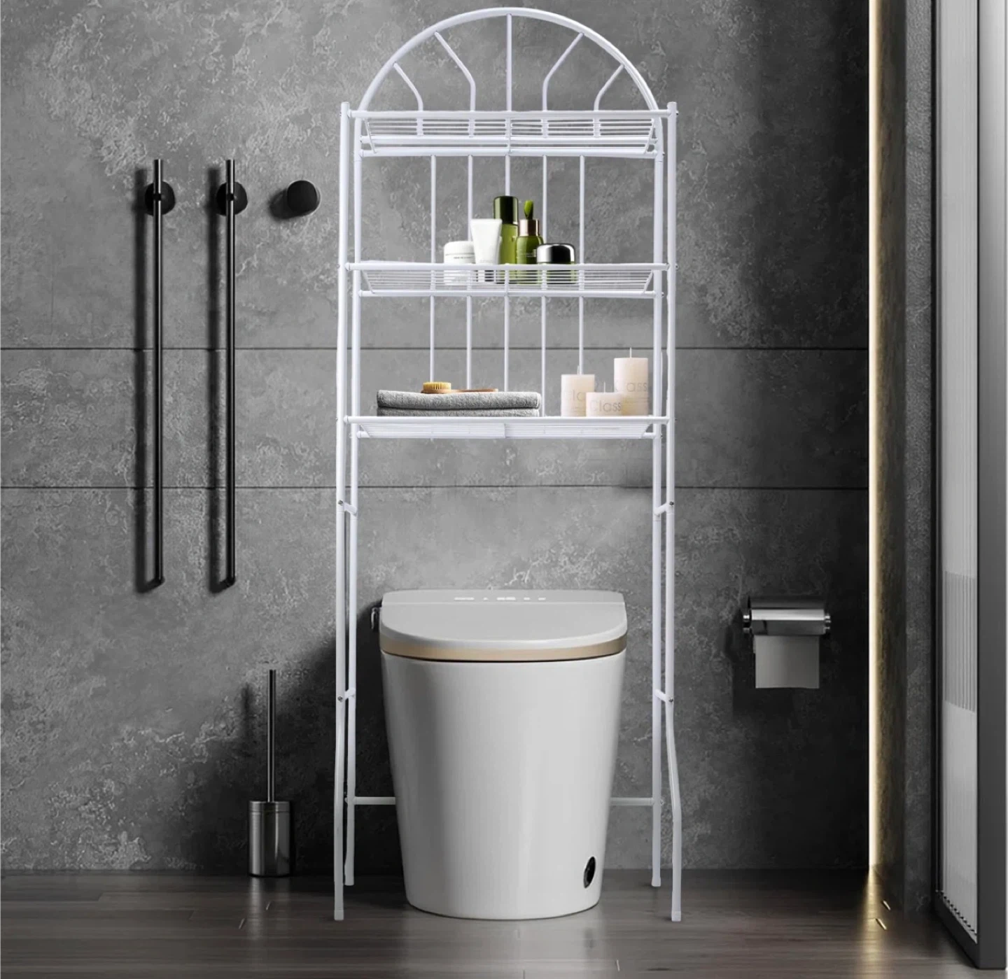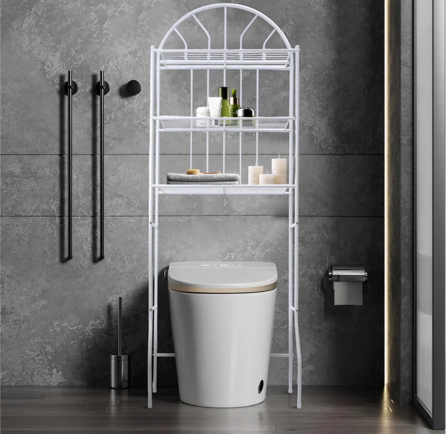 This white over-the-toilet storage shelf is a great way to maximize space in your bathroom! Brand new in box. Material is metal.