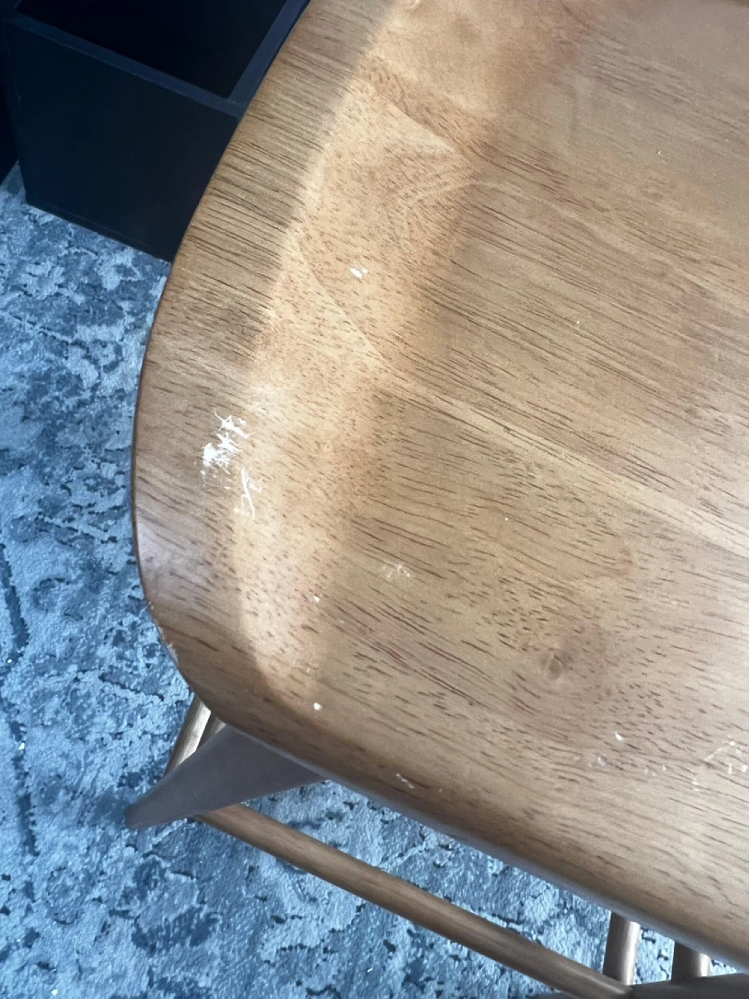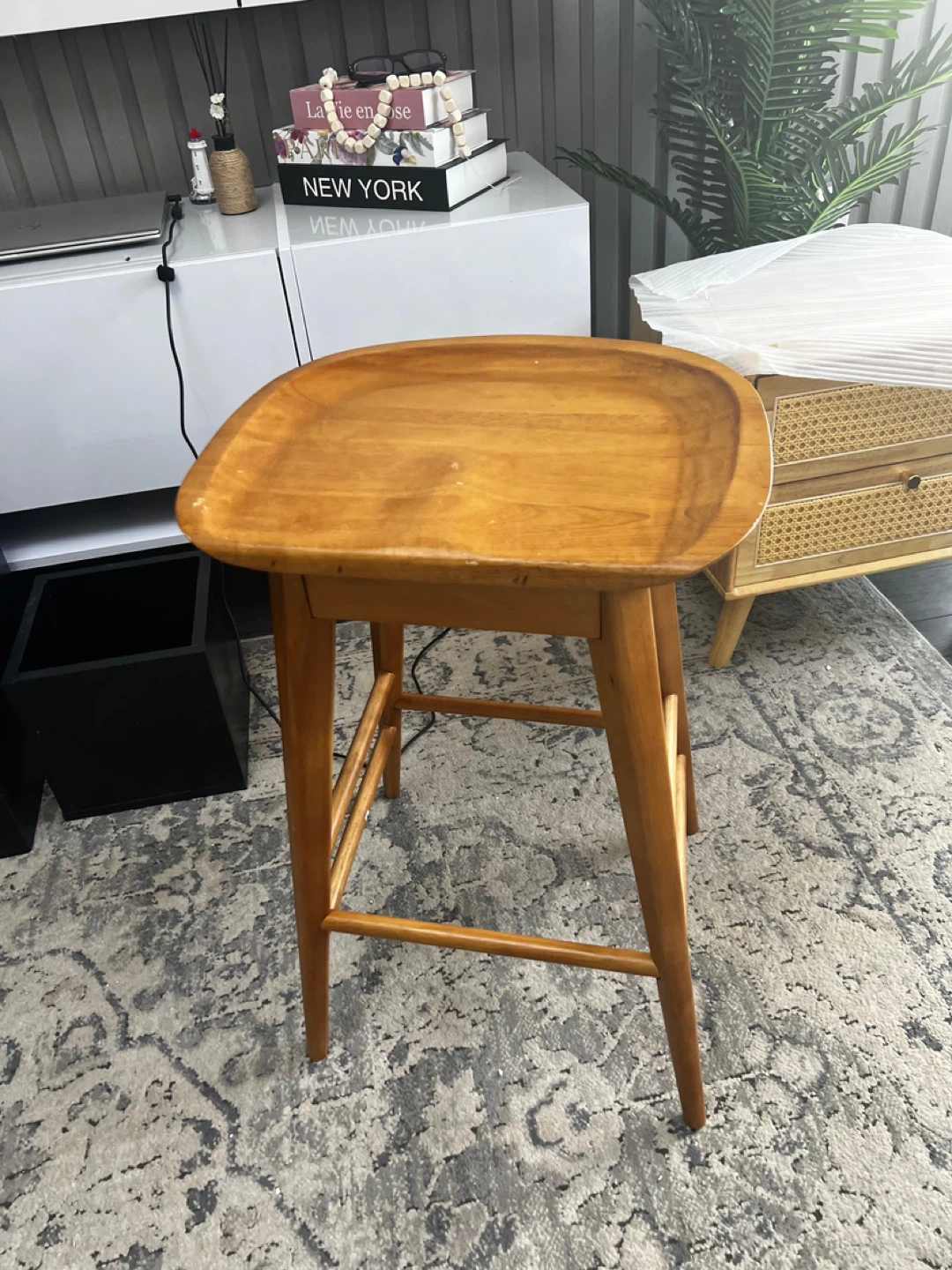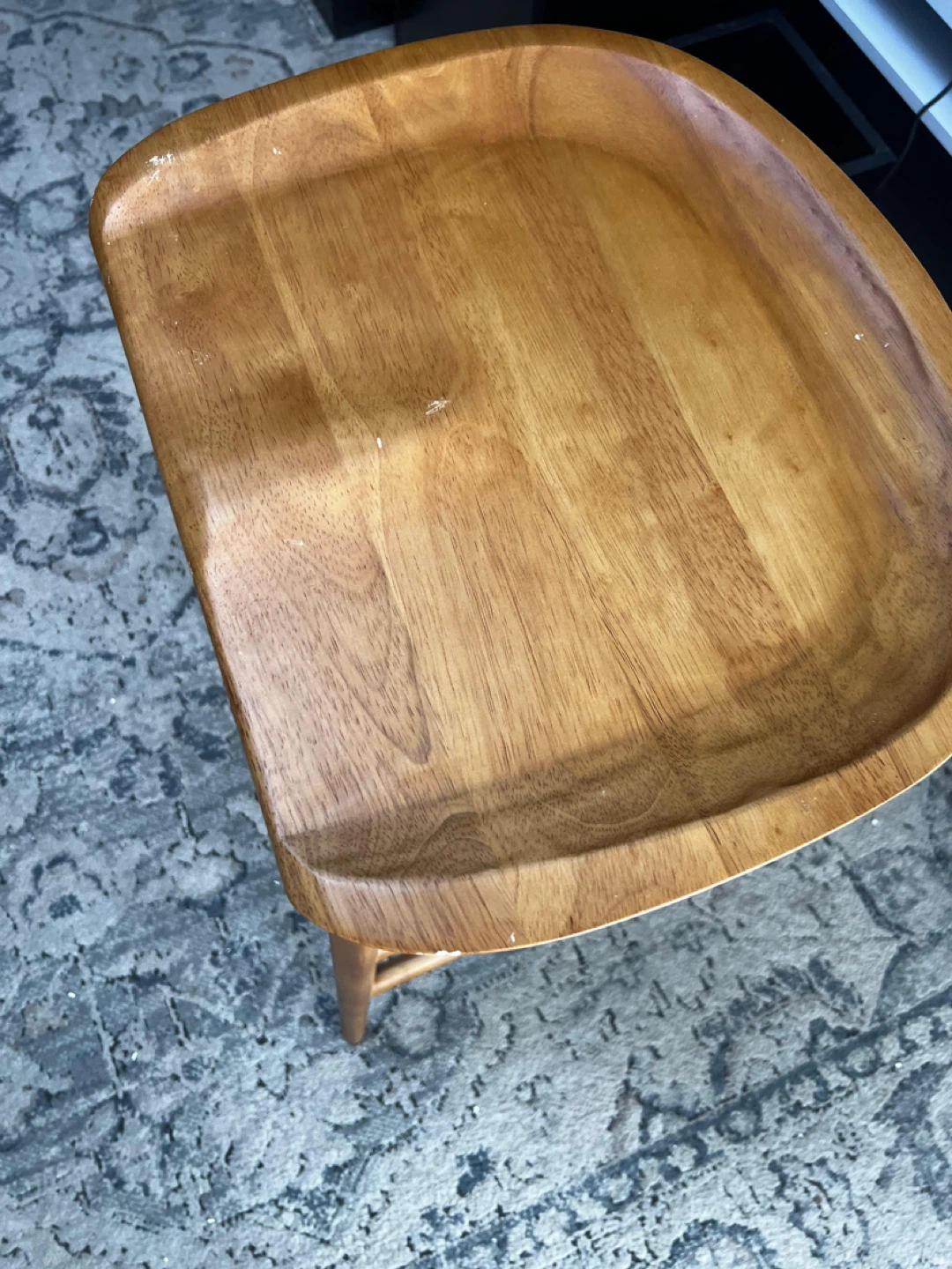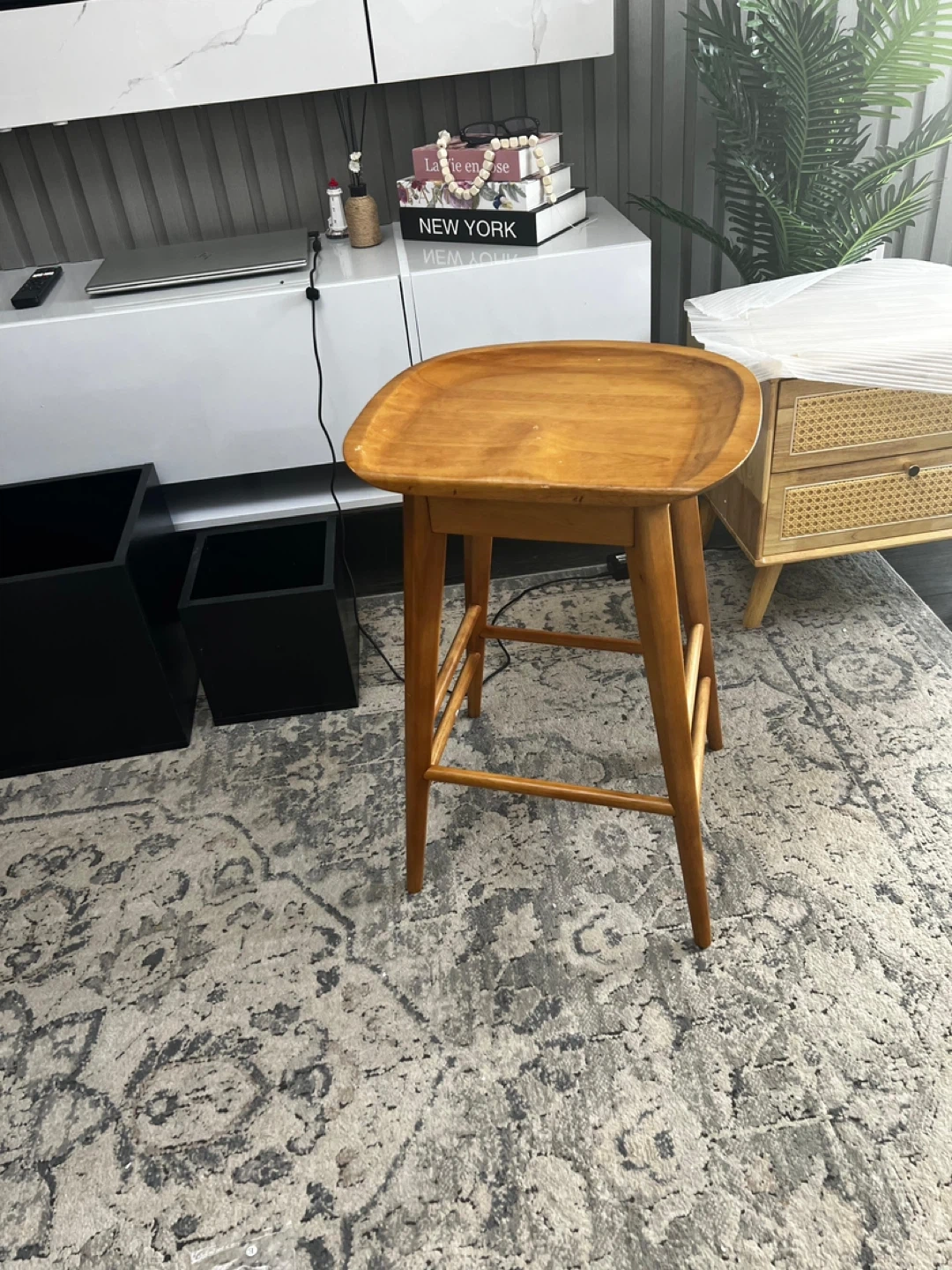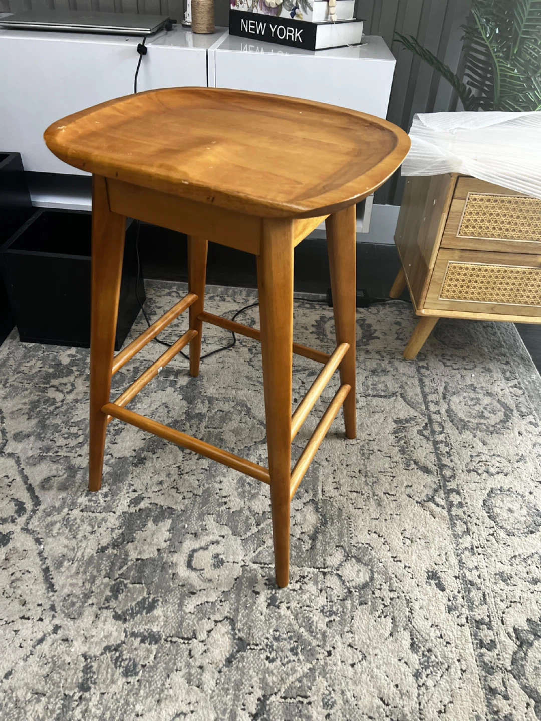 Selling a wooden bar stool. It has a natural wood finish and a simple, classic design. There are a few minor scratches on the top surface, but it's still in good condition and sturdy for use