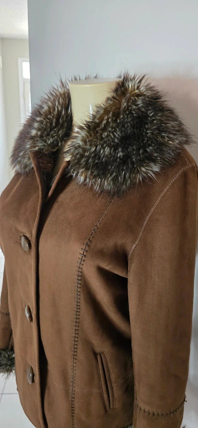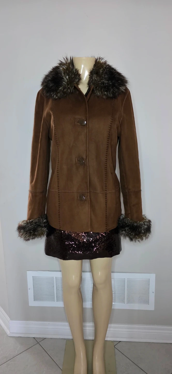 Here's a stylish brown jacket made of faux suede material. It features a fur trim around the collar and cuffs, adding a touch of elegance. It has a button-up closure and is in great condition! Very unique peice!
