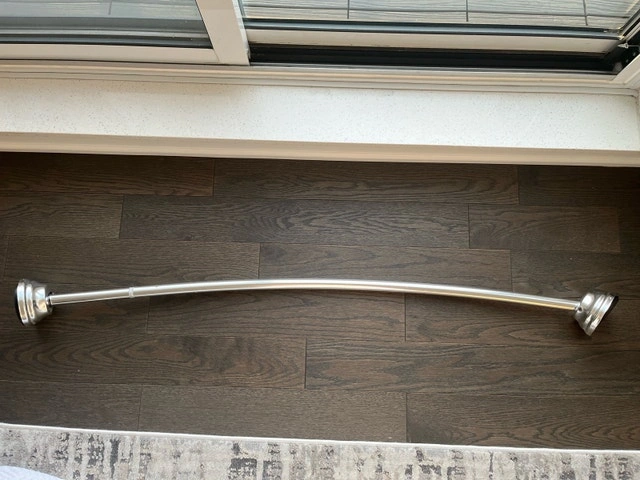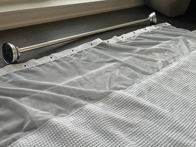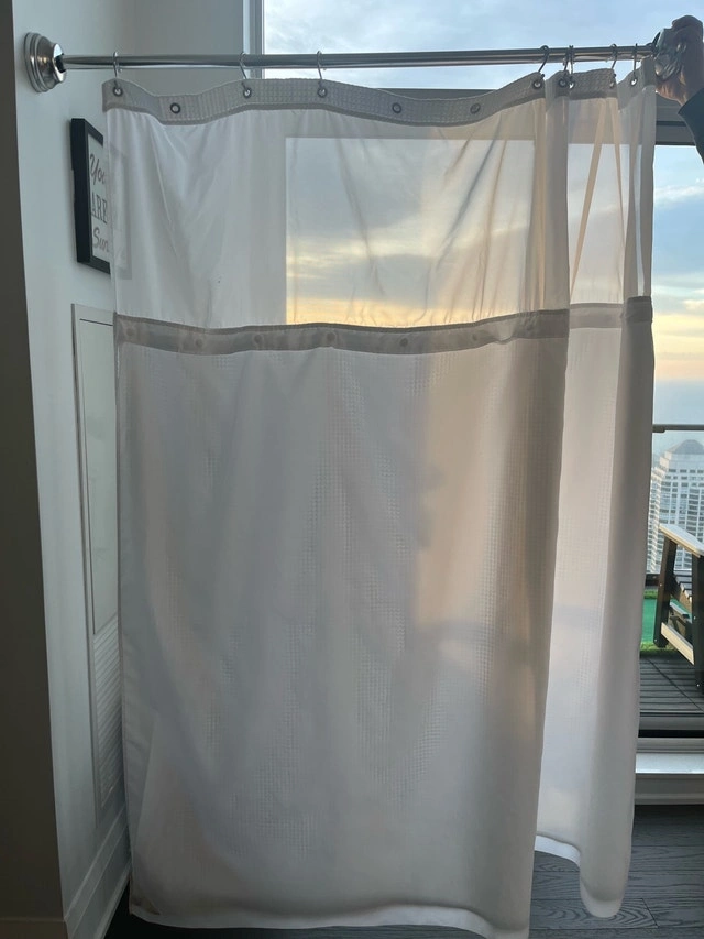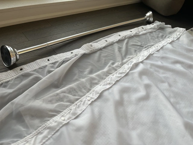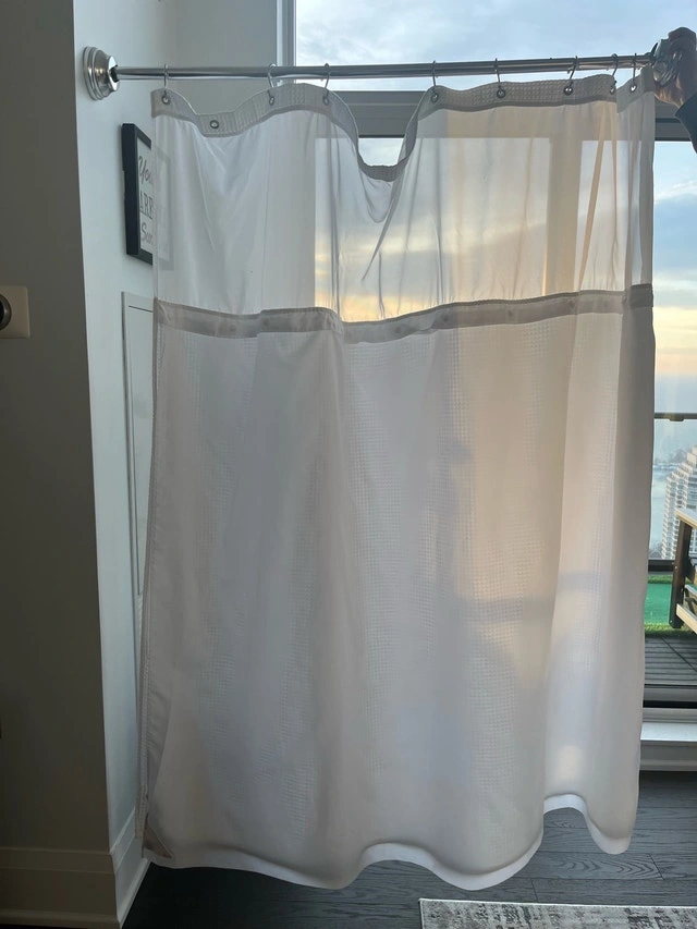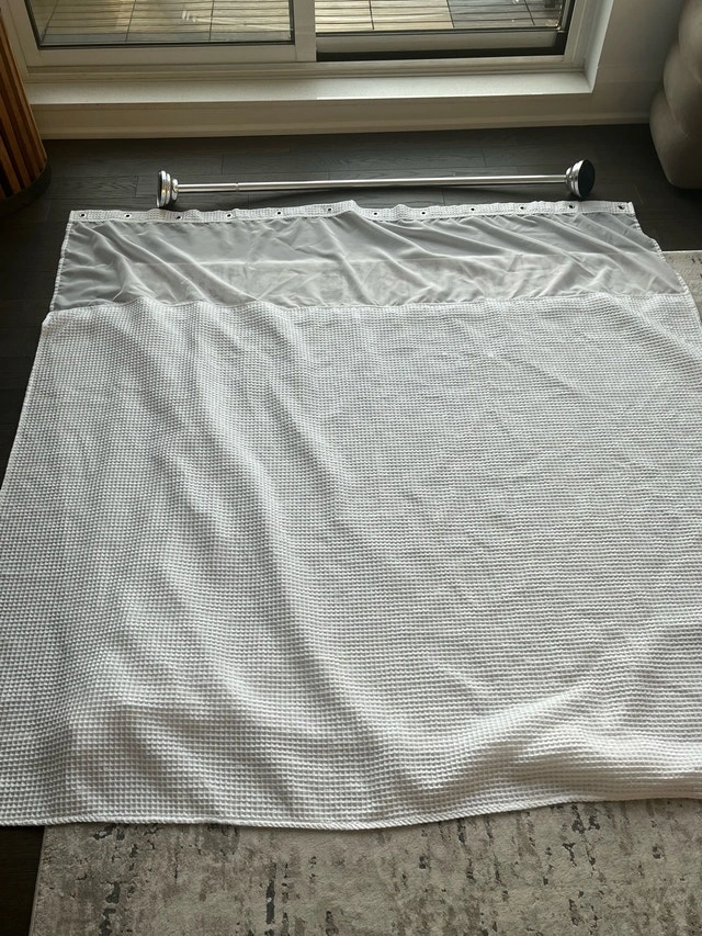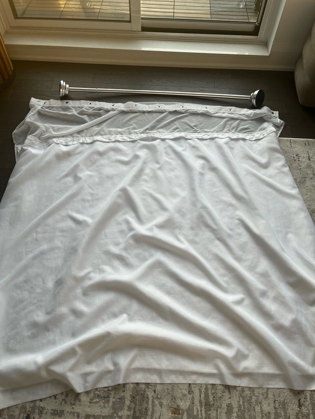 Add a touch of elegance to your bathroom with this white shower curtain and extendable rod!