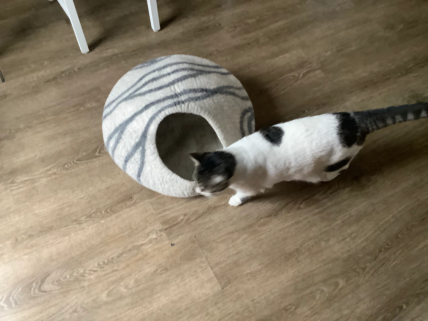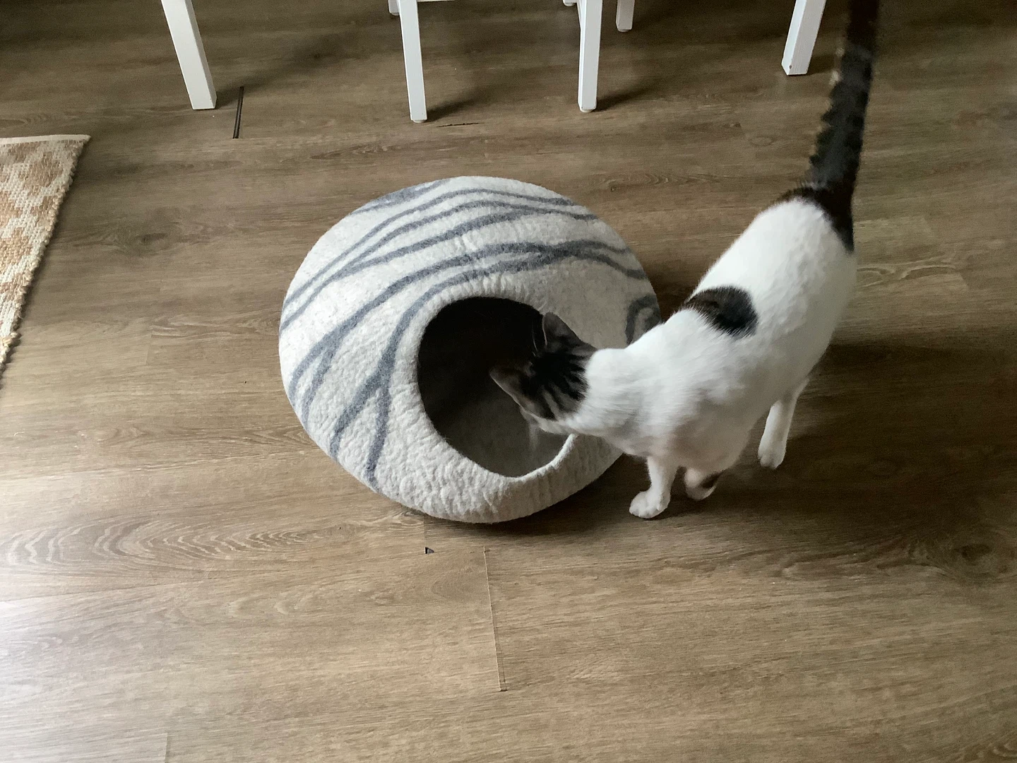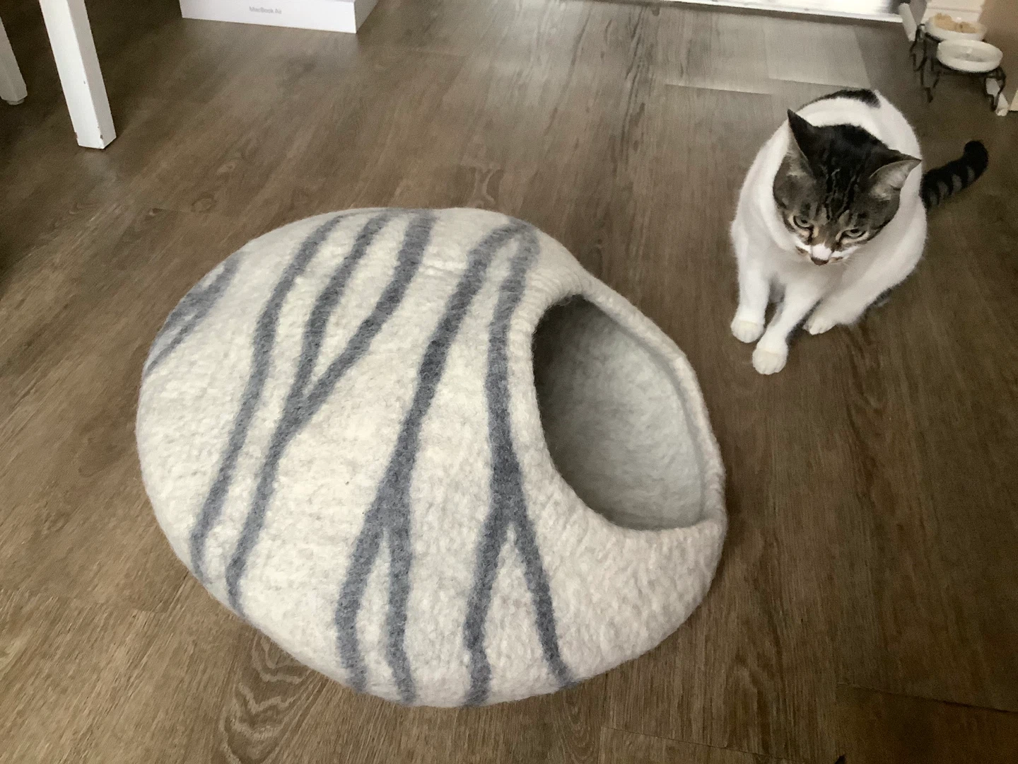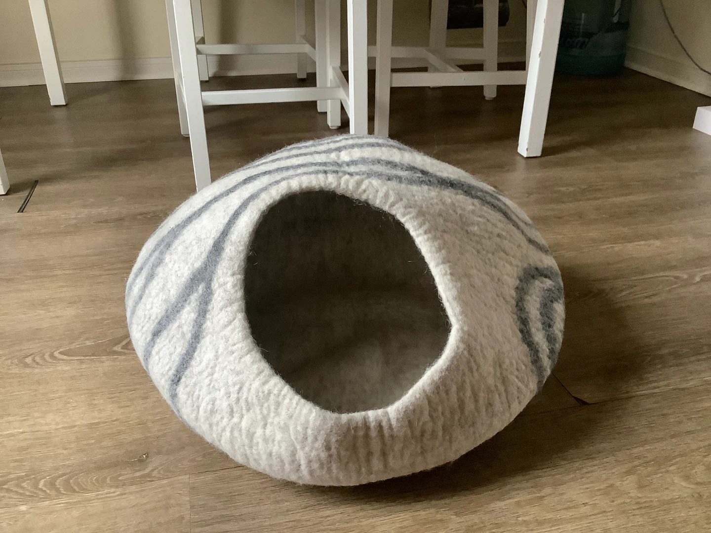 Here's a cozy felt cat cave bed! It's in great shape, used less than 2 months and ready for a furry friend to call home. The neutral grey and white stripes will fit in with any decor. Height 12 in, width 19 in.