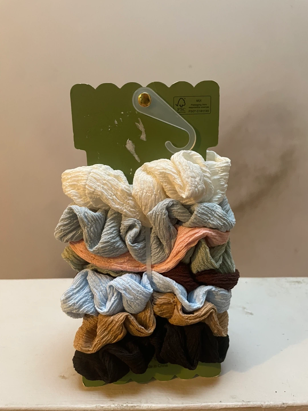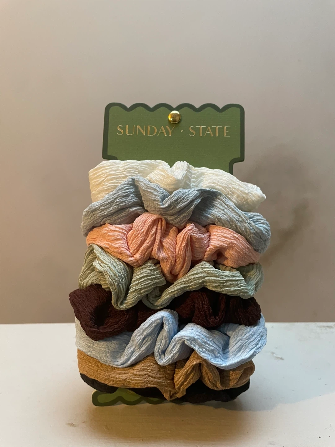 I have a set of Sunday State scrunchies for sale. They are brand new and come in a variety of colours including white, blue, pink, brown, and black. Perfect for adding a touch of style to any hairstyle!