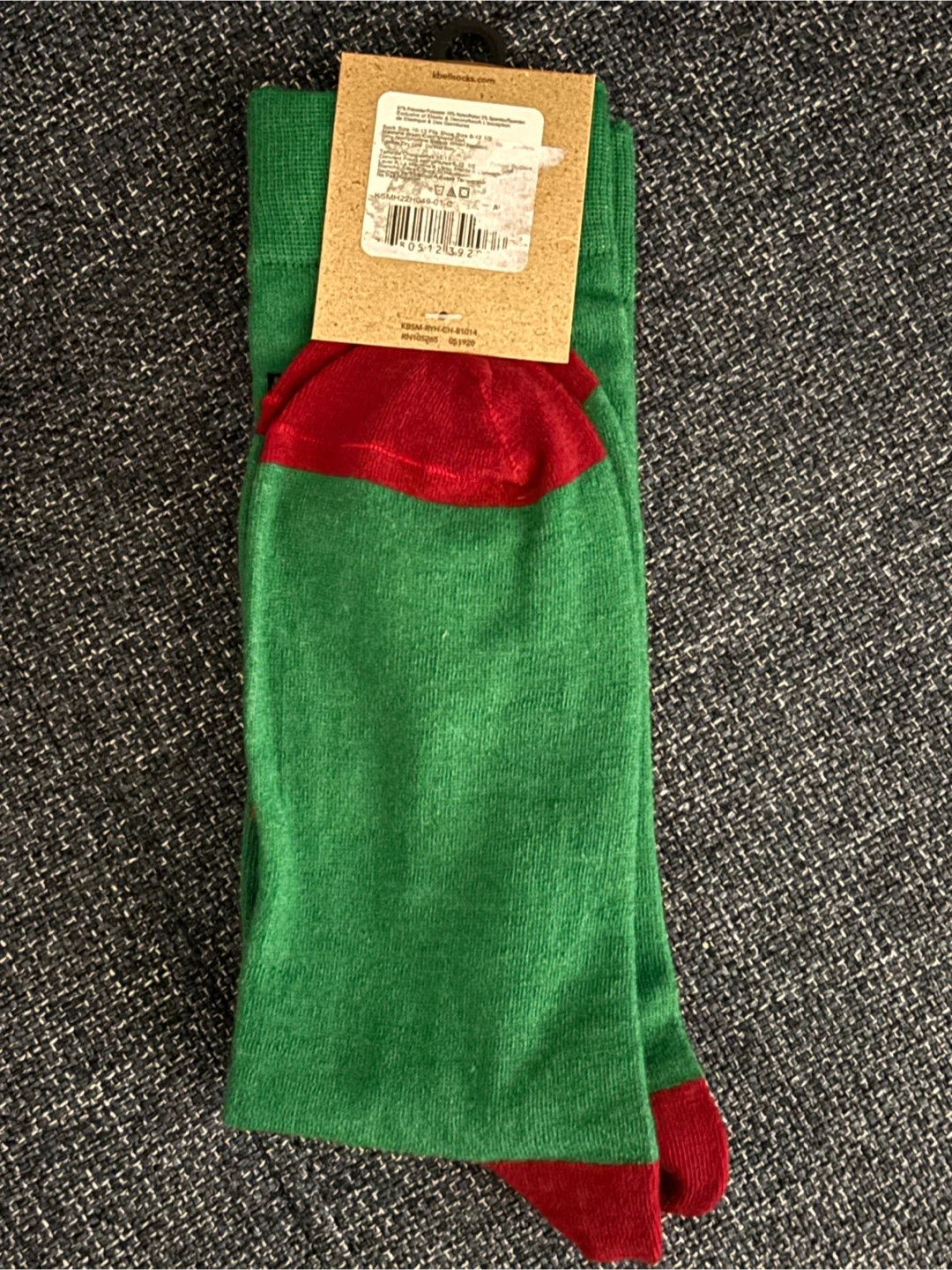 Here are some fun K. Bell men's crew socks! They're green with a red cuff and feature a 'Dear Santa Don't Judge Me' design.