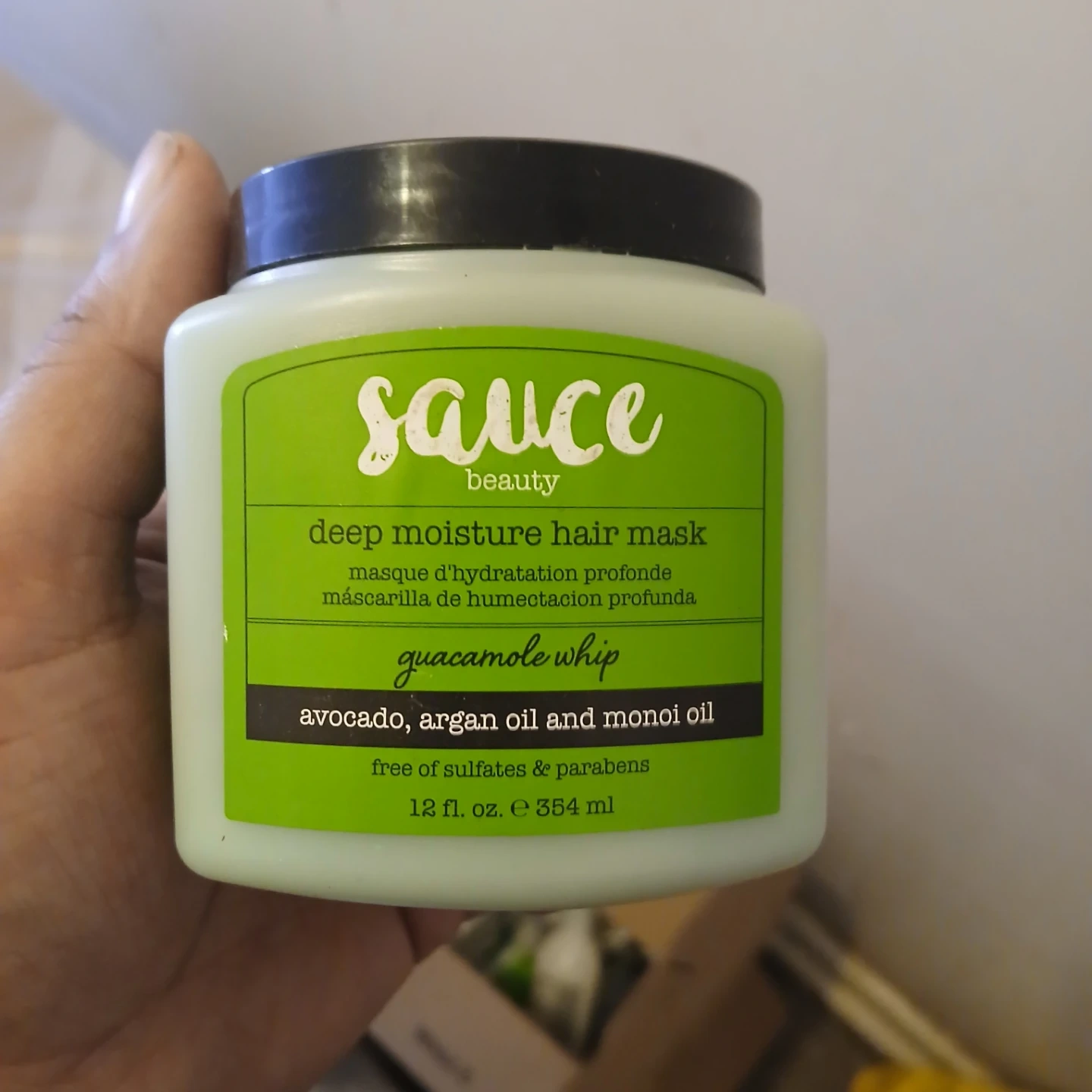 I'm selling a Sauce Beauty deep moisture hair mask. It's a guacamole whip with avocado, argan oil, and monoi oil. It is free of sulfates and parabens and comes in a 12 fl oz (354 ml) container
