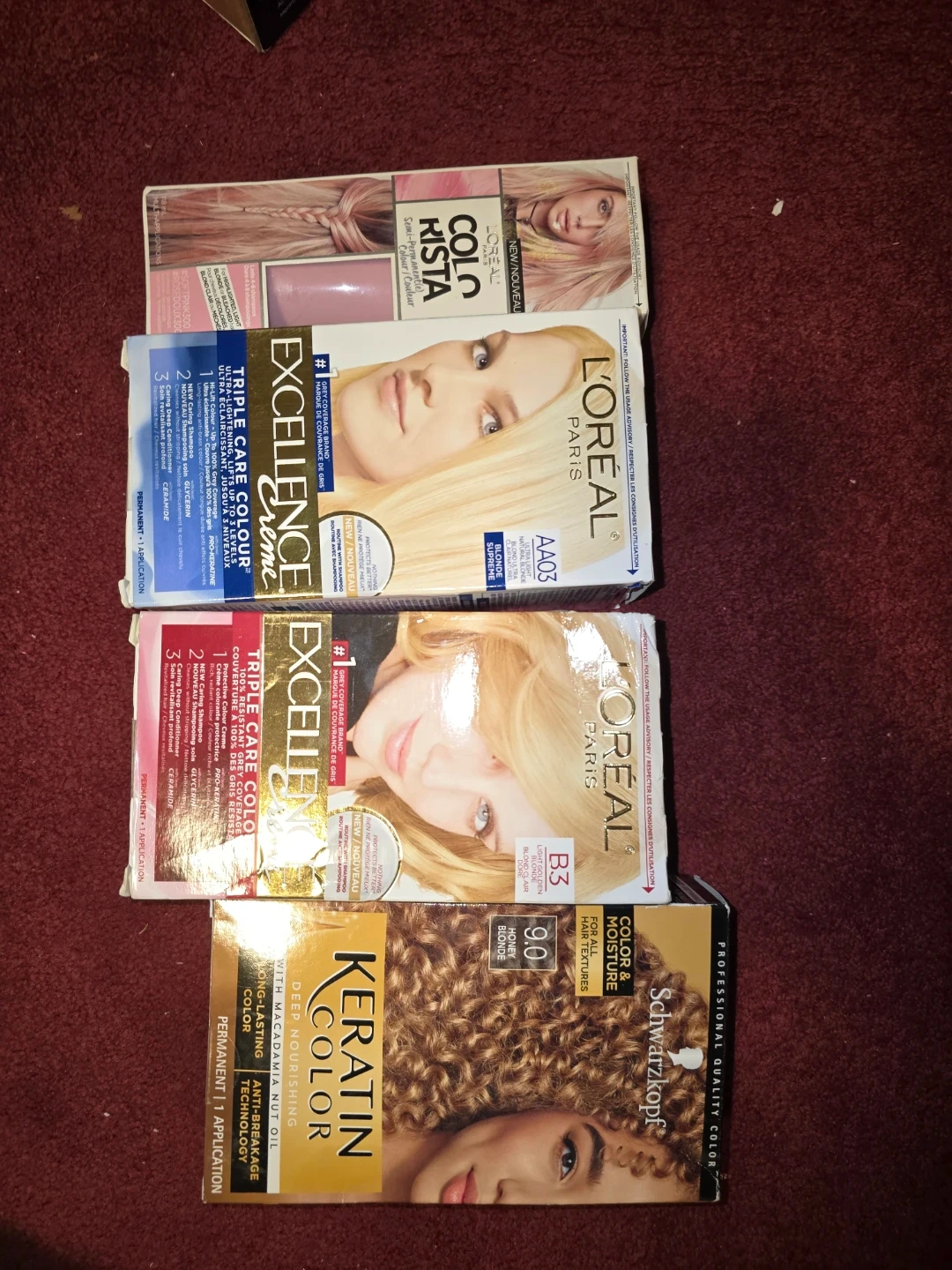 Selling a variety of hair dye boxes from L'Oreal and Schwarzkopf. Included are L'Oreal Excellence Creme in Blonde Supreme AA03, L'Oreal Excellence in Light Golden Blonde B3, L'Oreal Colorista, and Schwarzkopf Keratin Color in Honey Blonde 9.0
