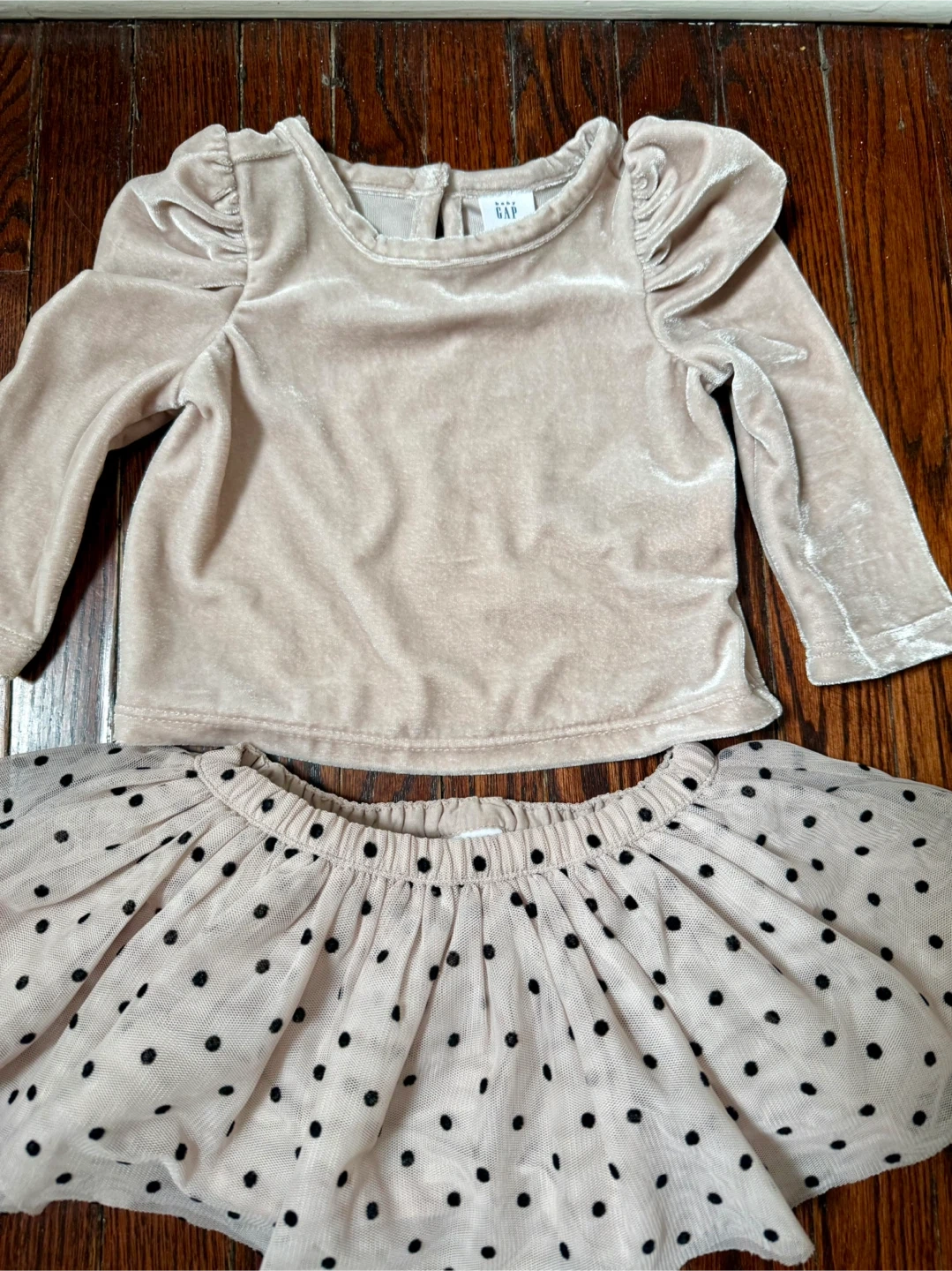 Baby Gap holiday sets, size 6-12mts. Includes a velvet top with polka dot skirt and a green floral dress with a matching headband. Only worn once! $15 each or $25 for both.