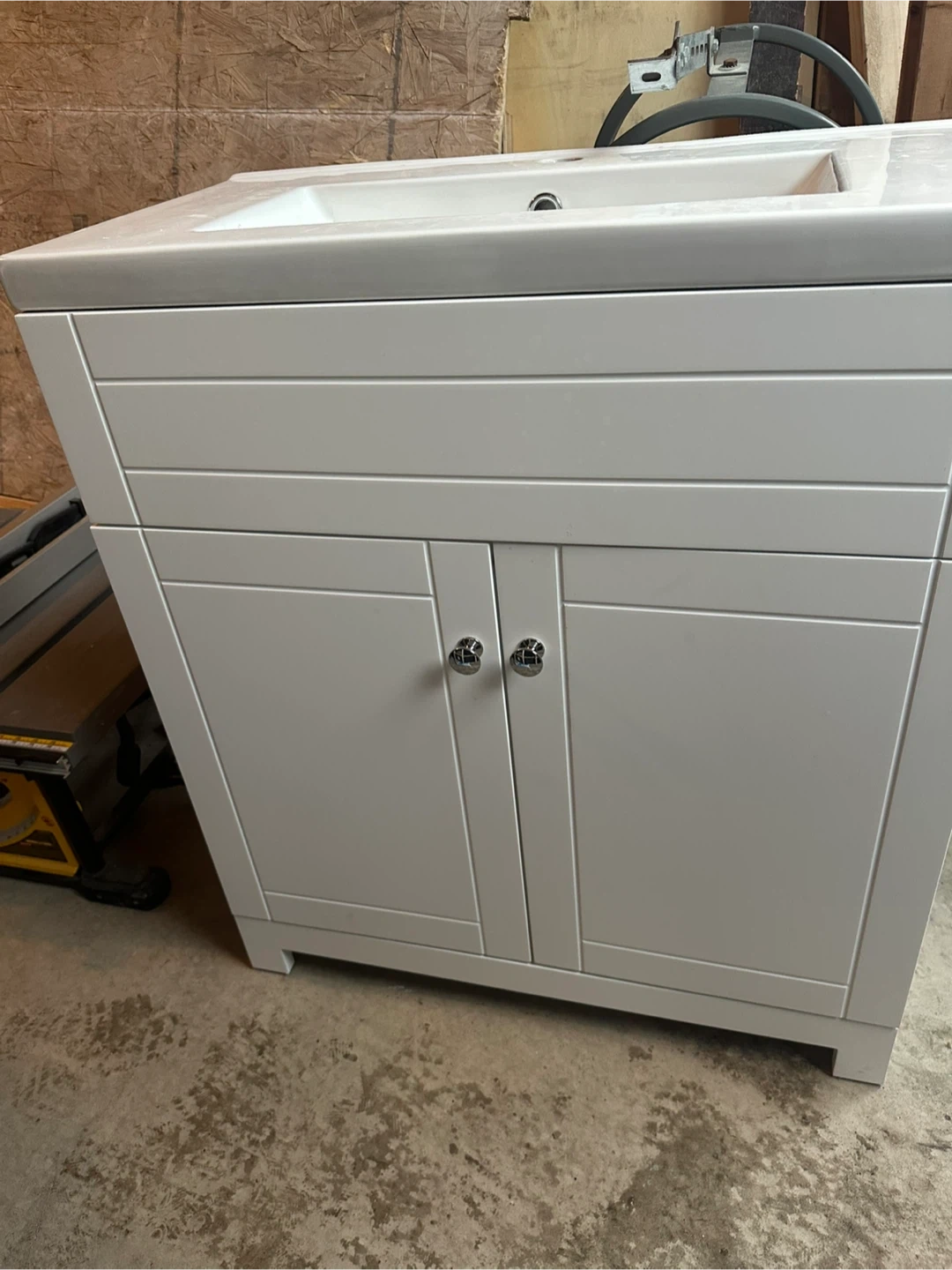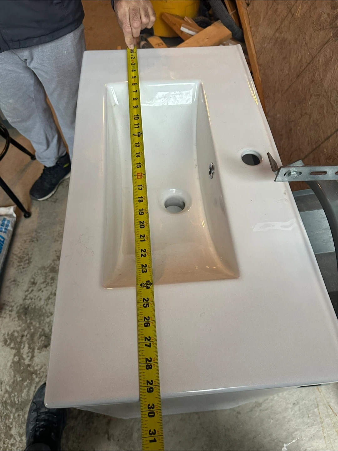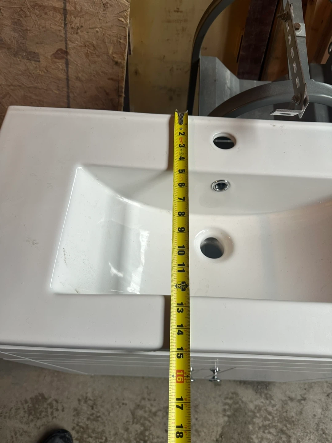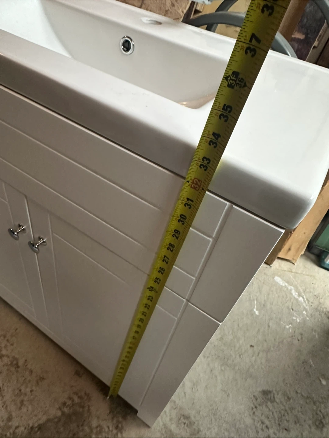 Here's a white vanity sink available! It's approximately 37 inches wide, 31 inches tall, and 18 inches deep. Great for a bathroom upgrade or renovation project