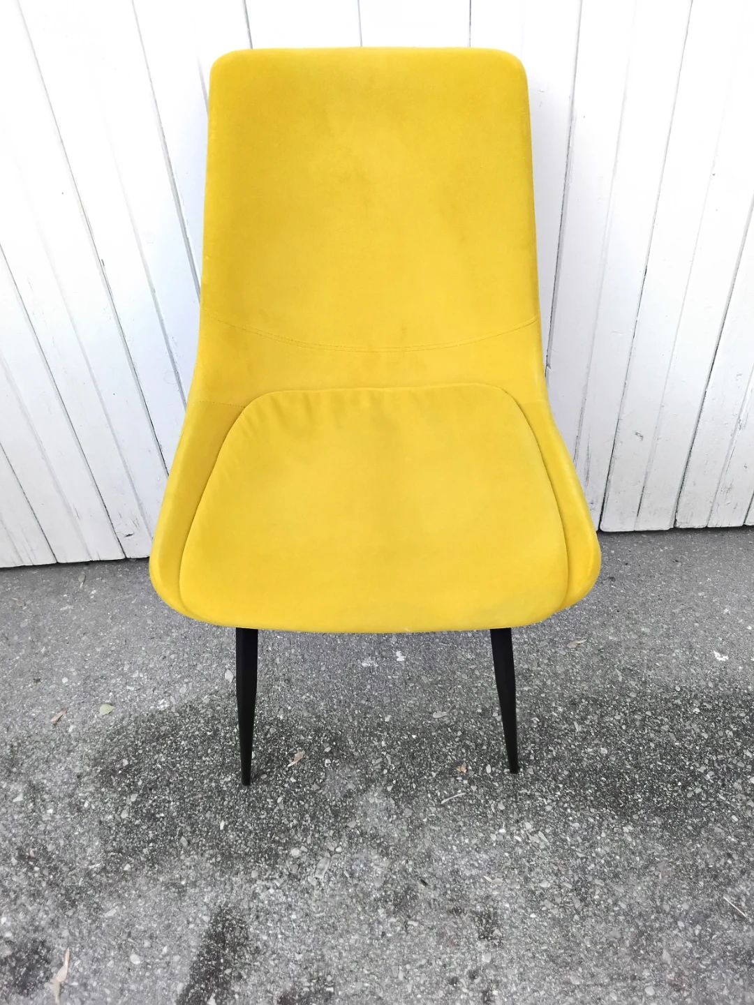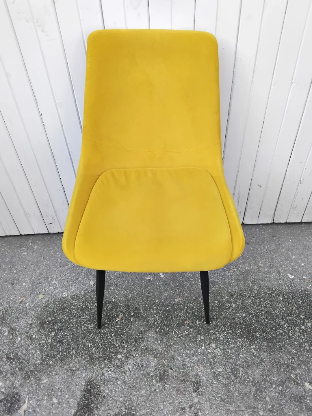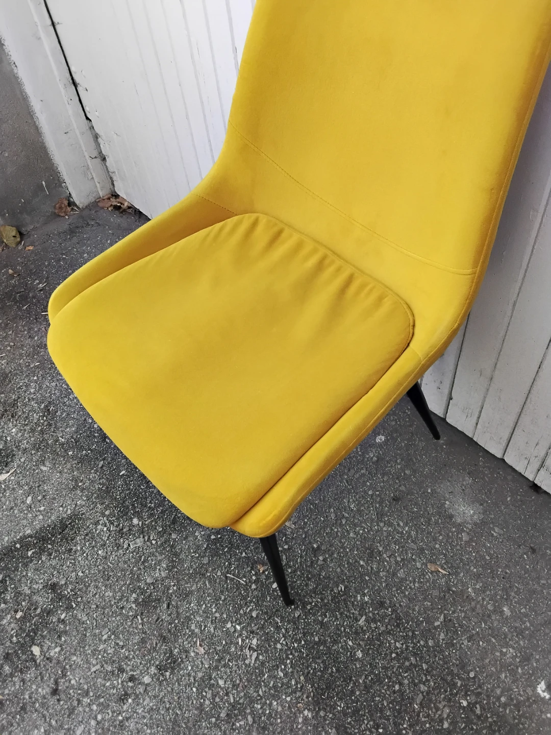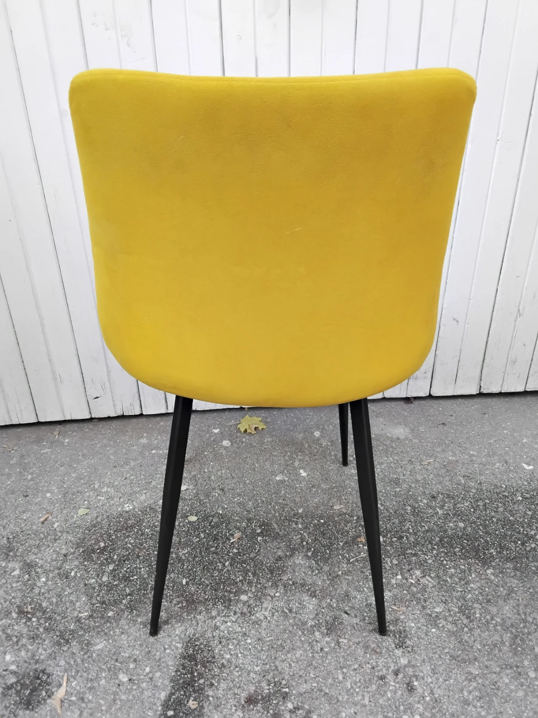 πΊ Here's a stylish yellow velvet dining chair! It would be a great addition to any dining room or living space. The chair features a soft velvet upholstery and sleek black legs. π