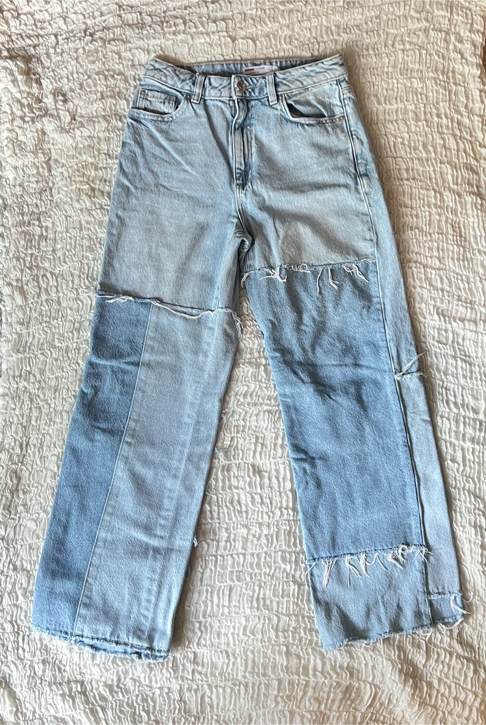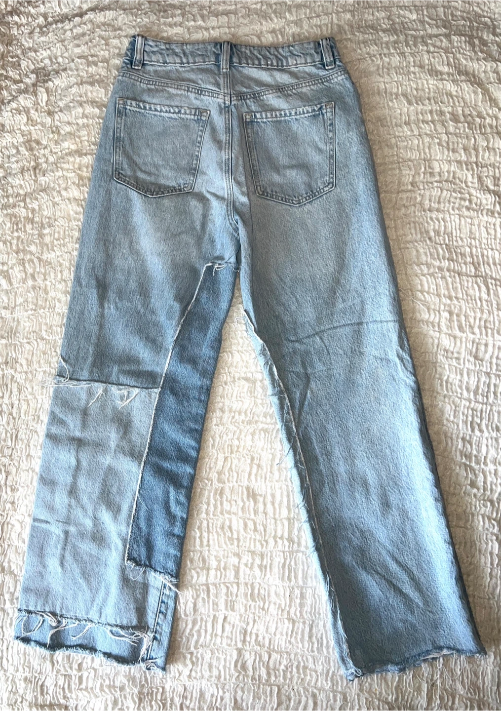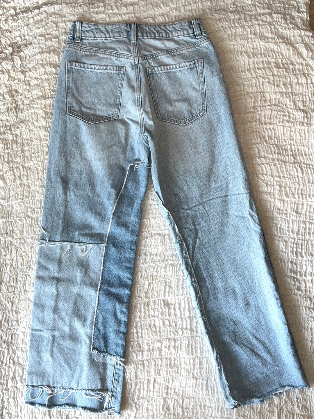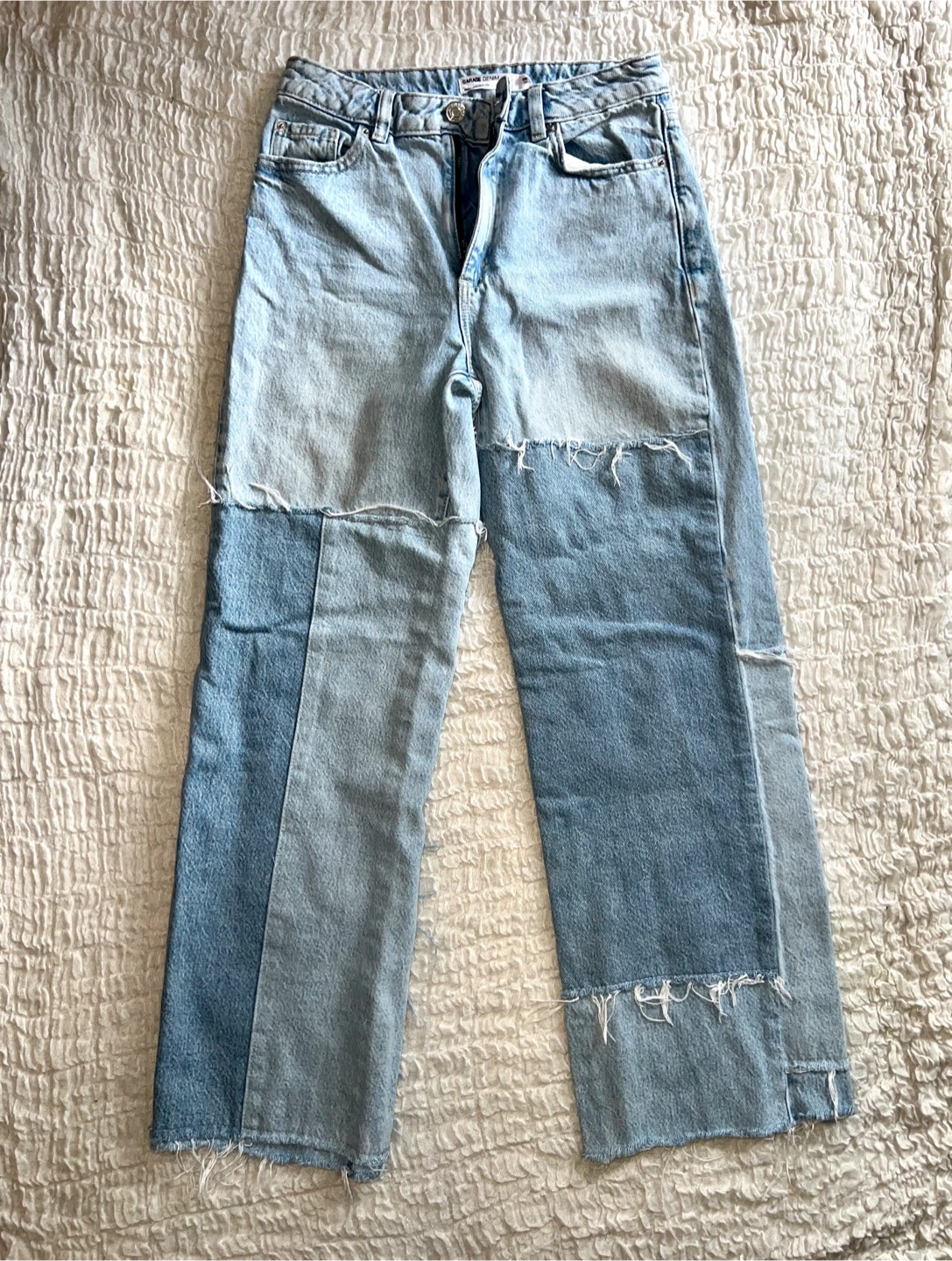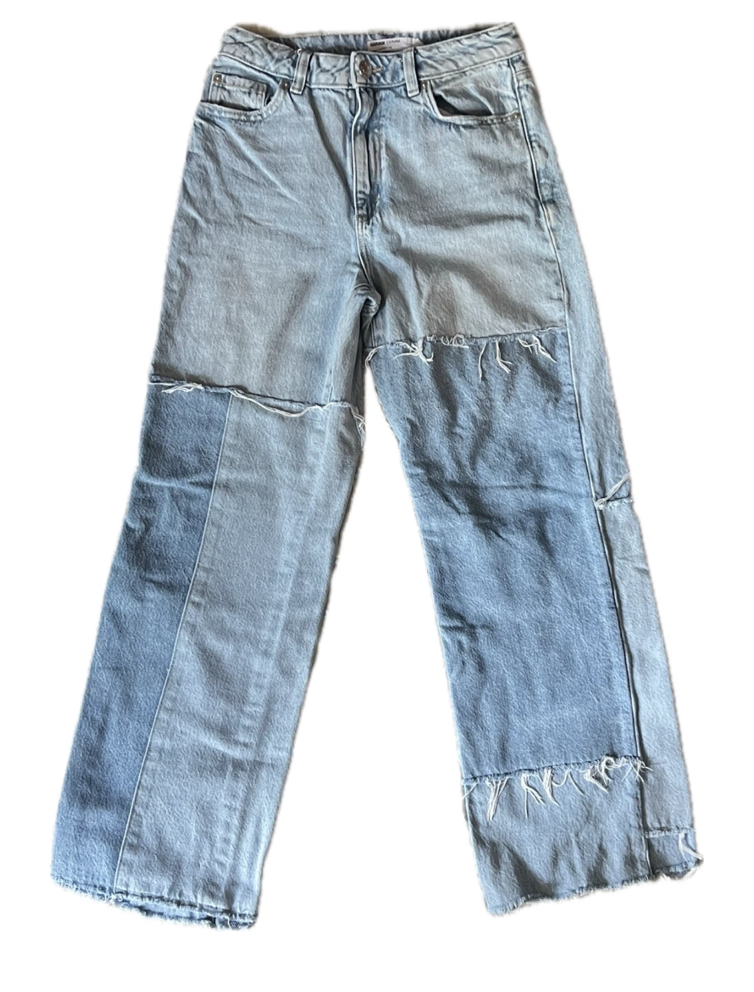 Selling a pair of Garage Denim jeans in size 5 / 27. These are the Jambe Large/Wide Leg style and feature a unique patchwork design with different shades of blue denim. They're in great condition and ready for a new home!