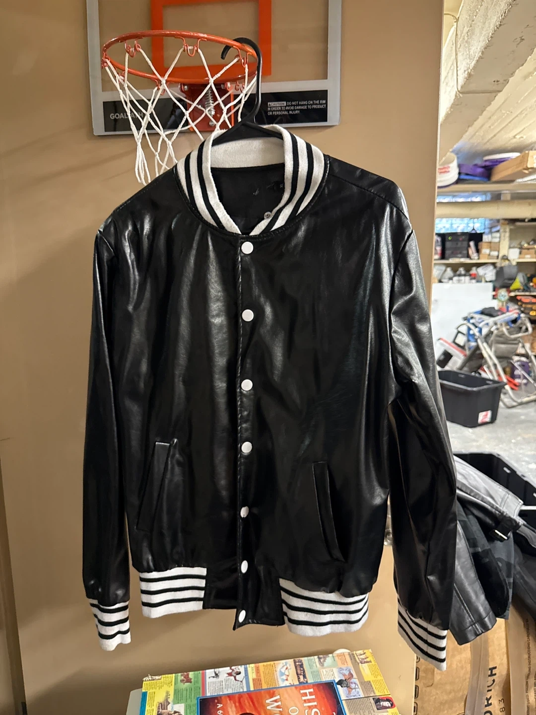 I have a black varsity jacket for sale. It features a white collar, cuffs, and waistband with black stripes. It's a size XL and in good condition!